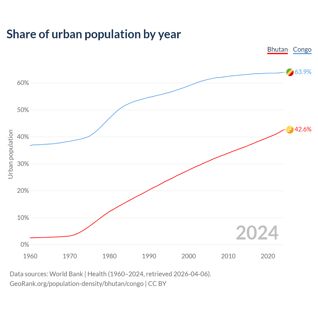 From 2004 to 2024, the share of urban population changed from 30.3% to 42.6% in Bhutan and from 60.9% to 63.9% in the Congo.
