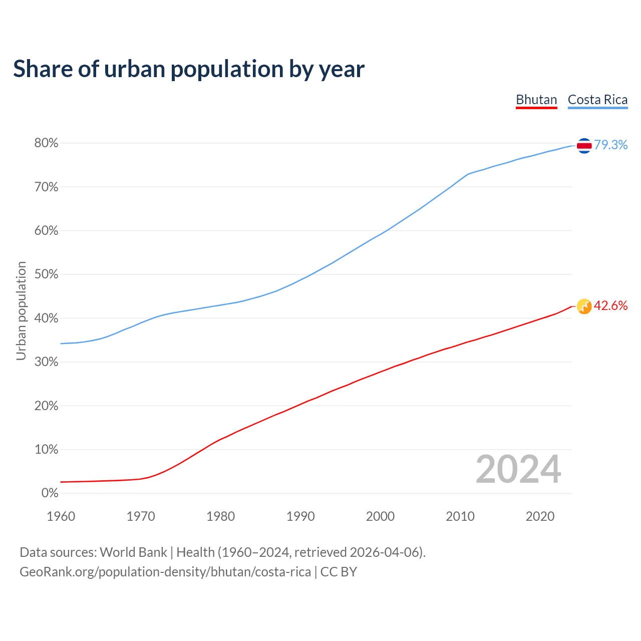 From 2004 to 2024, the share of urban population changed from 30.3% to 42.6% in Bhutan and from 63.7% to 79.3% in Costa Rica.