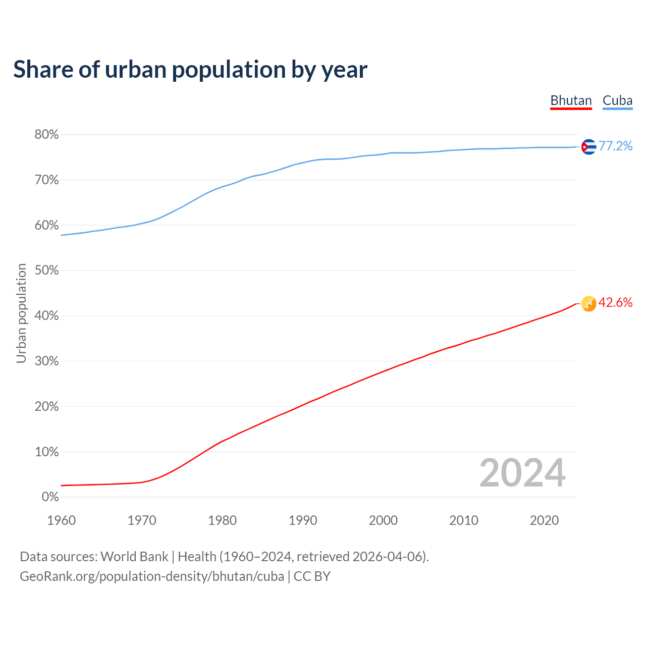 From 2004 to 2024, the share of urban population changed from 30.3% to 42.6% in Bhutan and from 75.9% to 77.2% in Cuba.