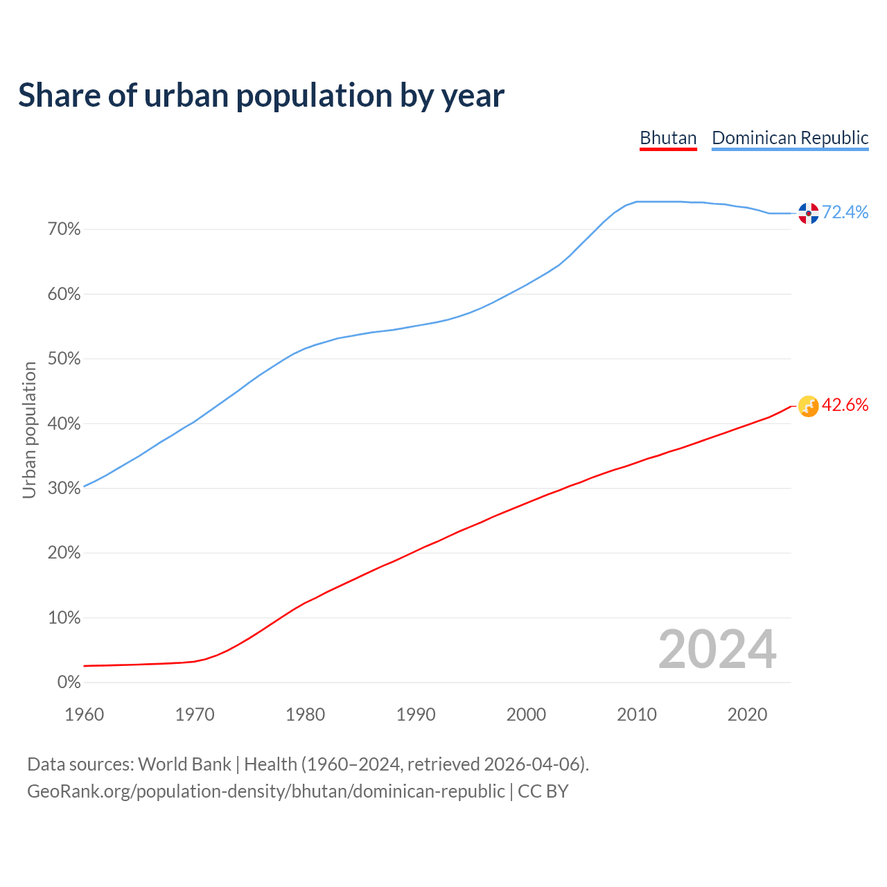 From 2004 to 2024, the share of urban population changed from 30.3% to 42.6% in Bhutan and from 65.9% to 72.4% in the Dominican Republic.