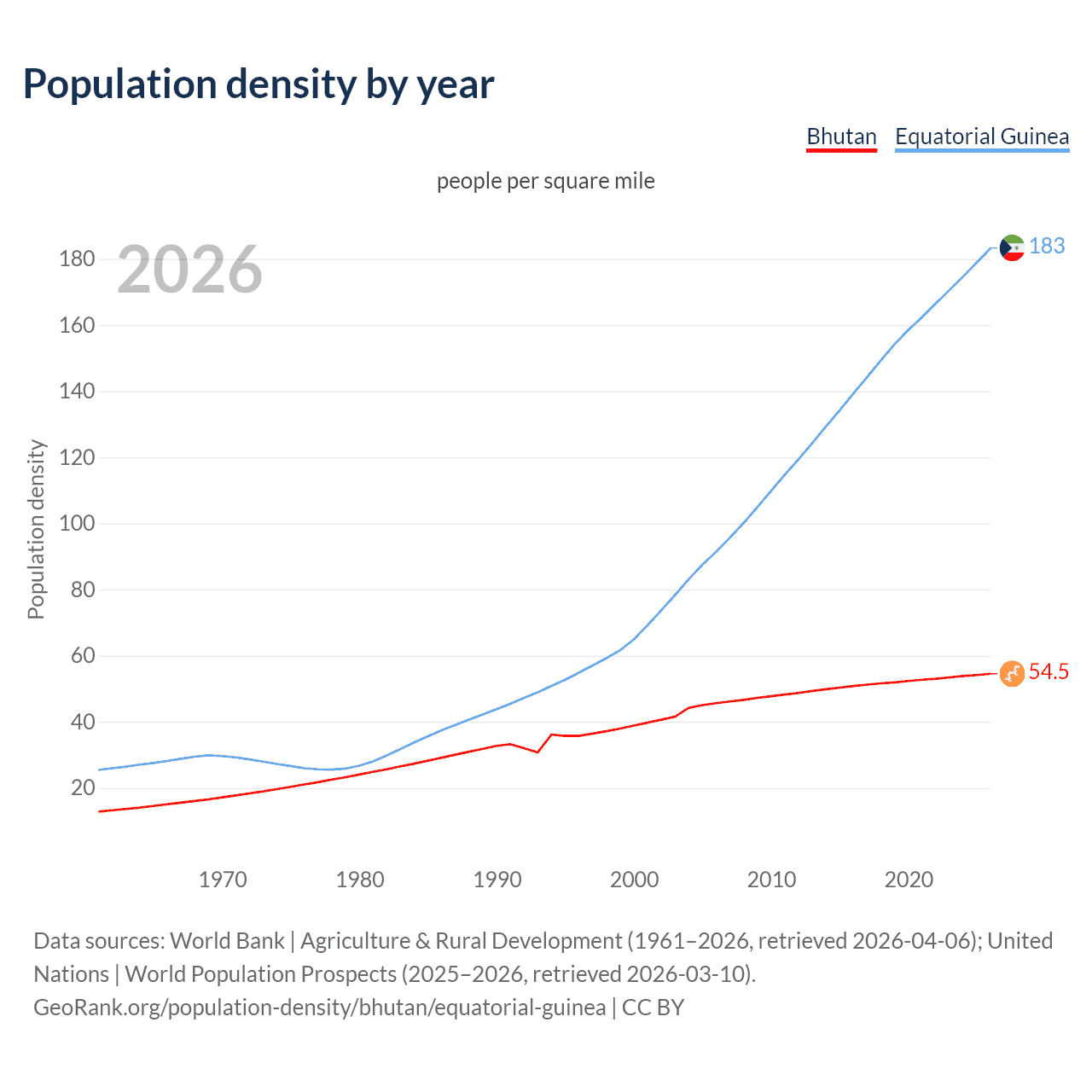 From 2006 to 2026, population density in Bhutan increased by 19.5%, compared to a 100.5% growth in Equatorial Guinea.