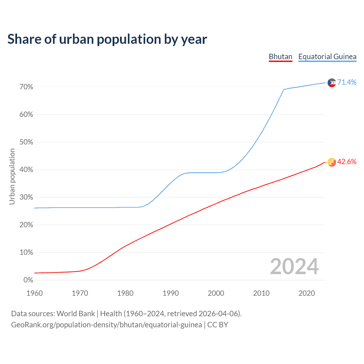 From 2004 to 2024, the share of urban population changed from 30.3% to 42.6% in Bhutan and from 40.9% to 71.4% in Equatorial Guinea.