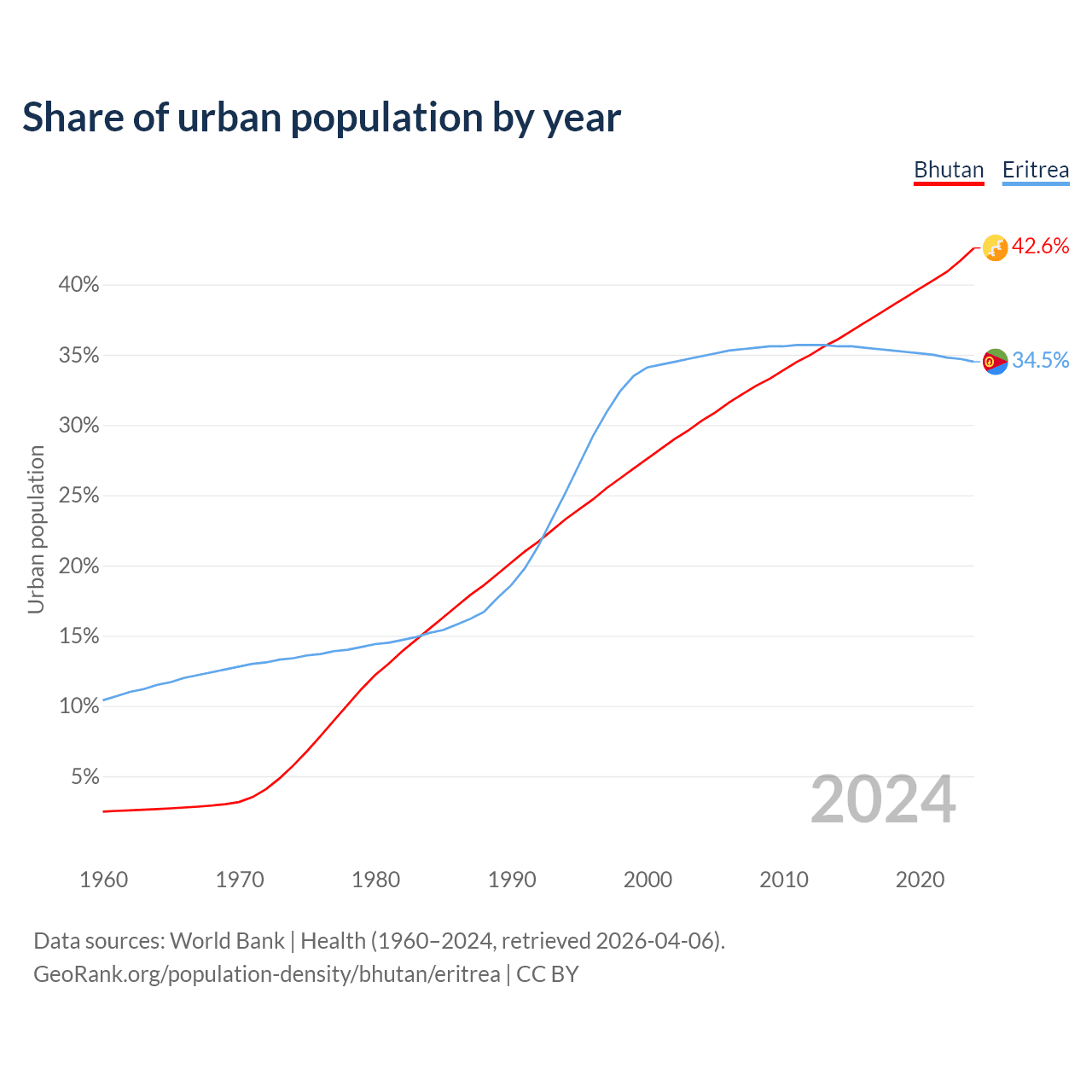 From 2004 to 2024, the share of urban population changed from 30.3% to 42.6% in Bhutan and from 34.9% to 34.5% in Eritrea.