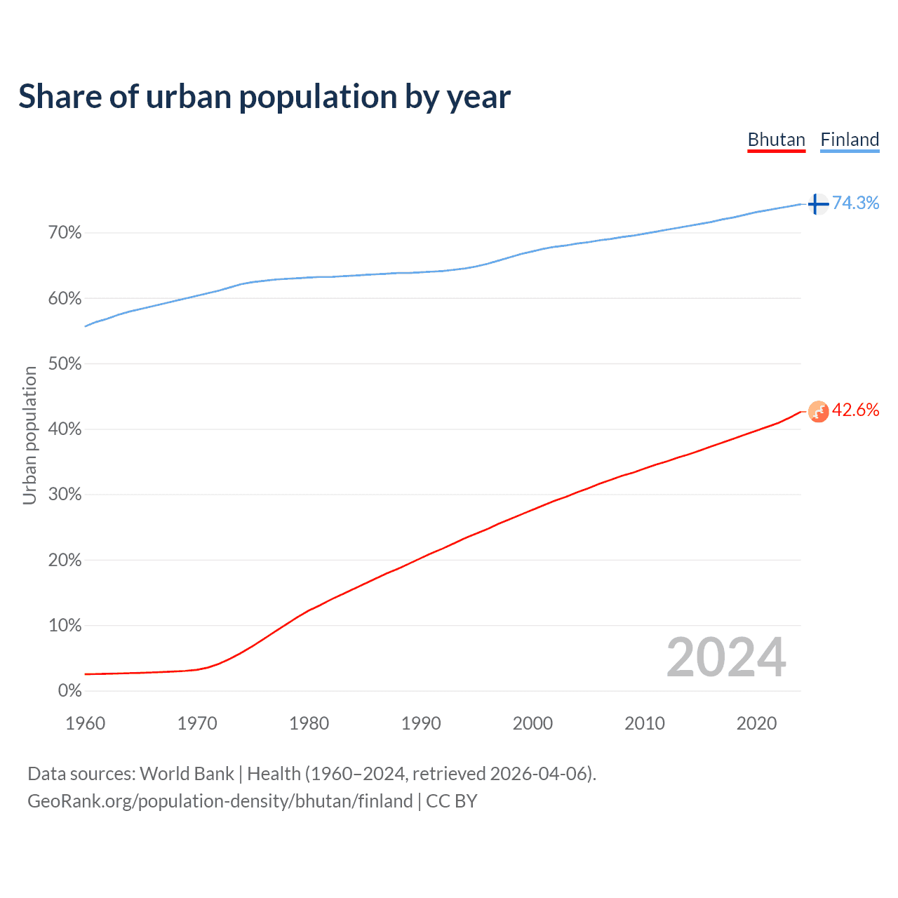From 2004 to 2024, the share of urban population changed from 30.3% to 42.6% in Bhutan and from 68.3% to 74.3% in Finland.