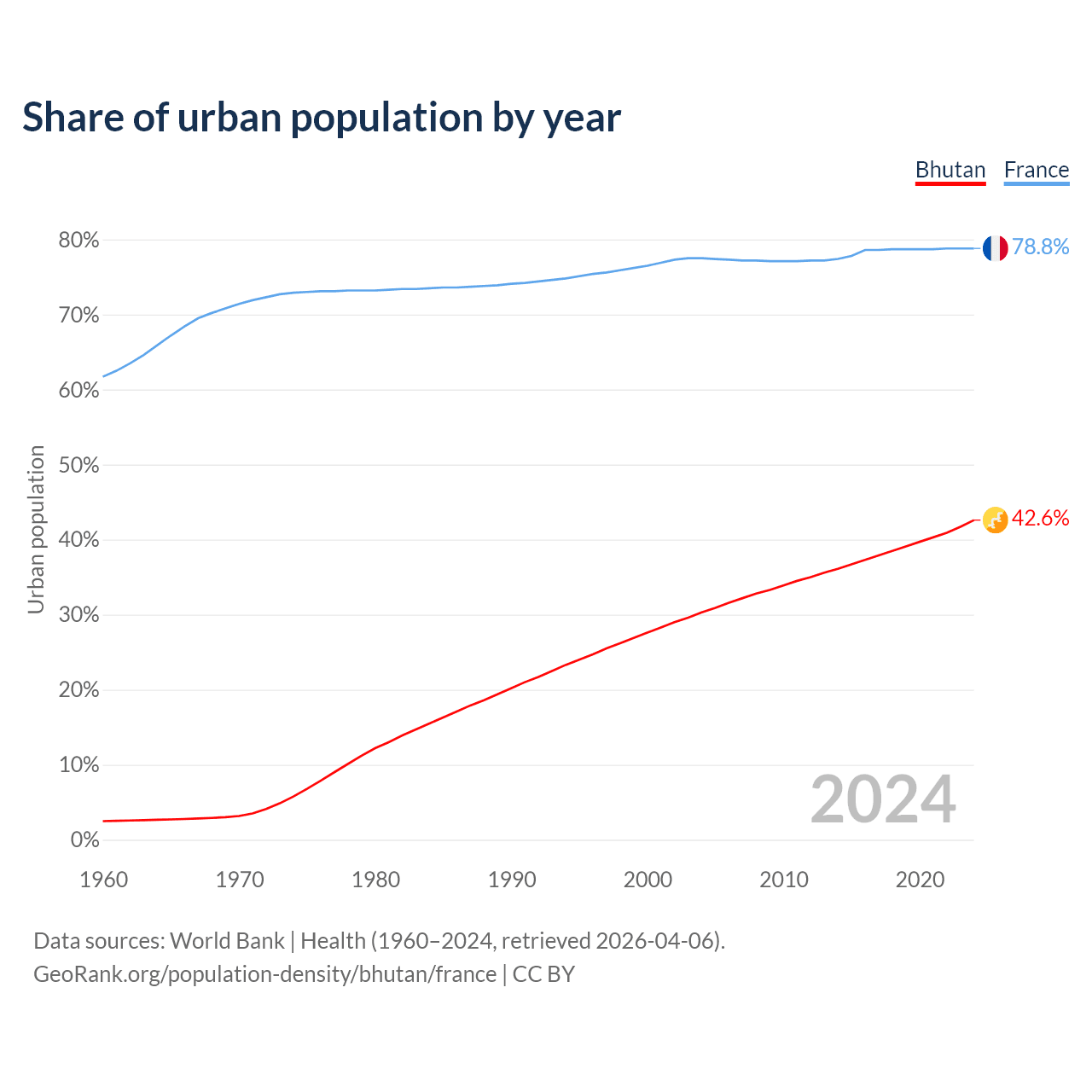 From 2004 to 2024, the share of urban population changed from 30.3% to 42.6% in Bhutan and from 77.5% to 78.8% in France.