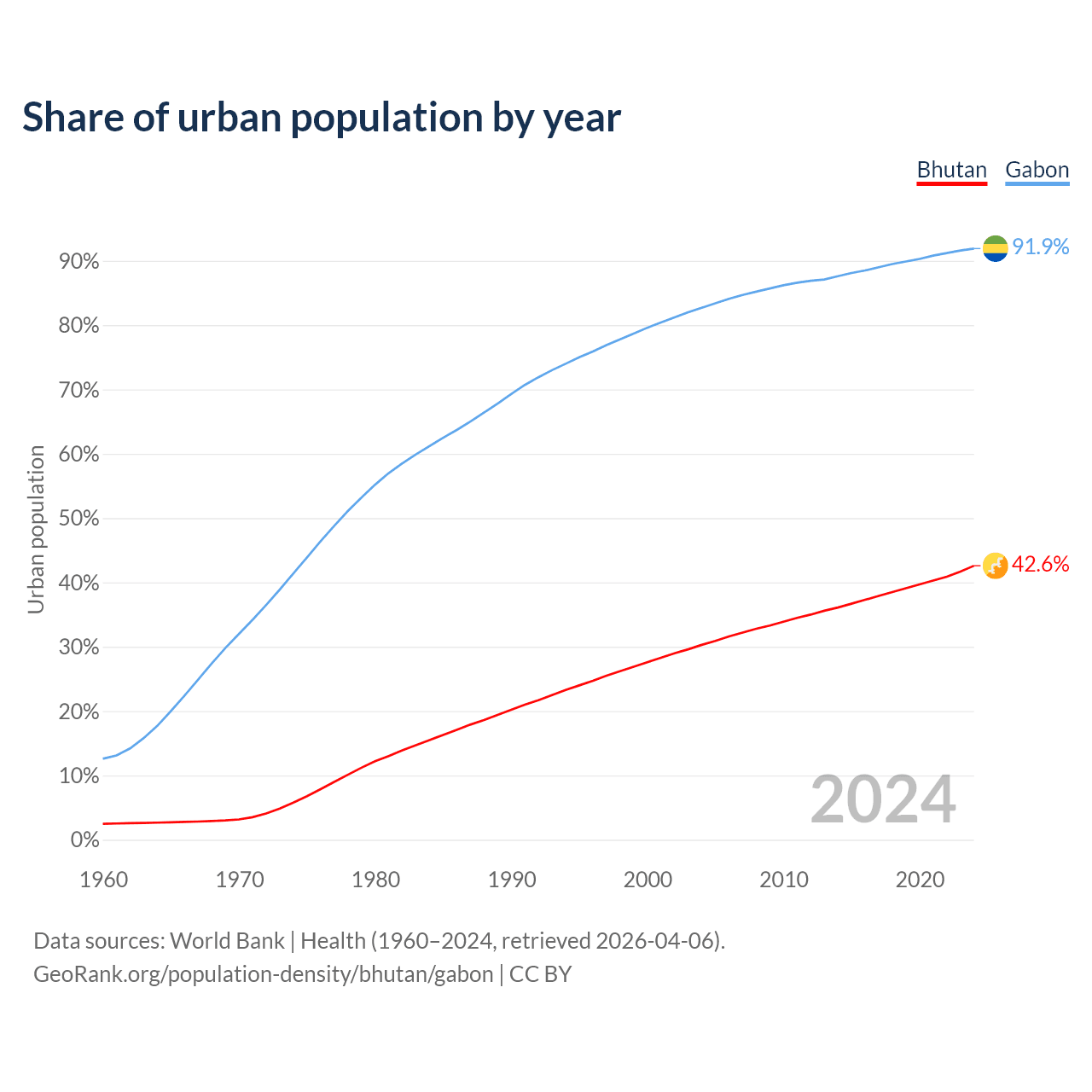 From 2004 to 2024, the share of urban population changed from 30.3% to 42.6% in Bhutan and from 82.7% to 91.9% in Gabon.