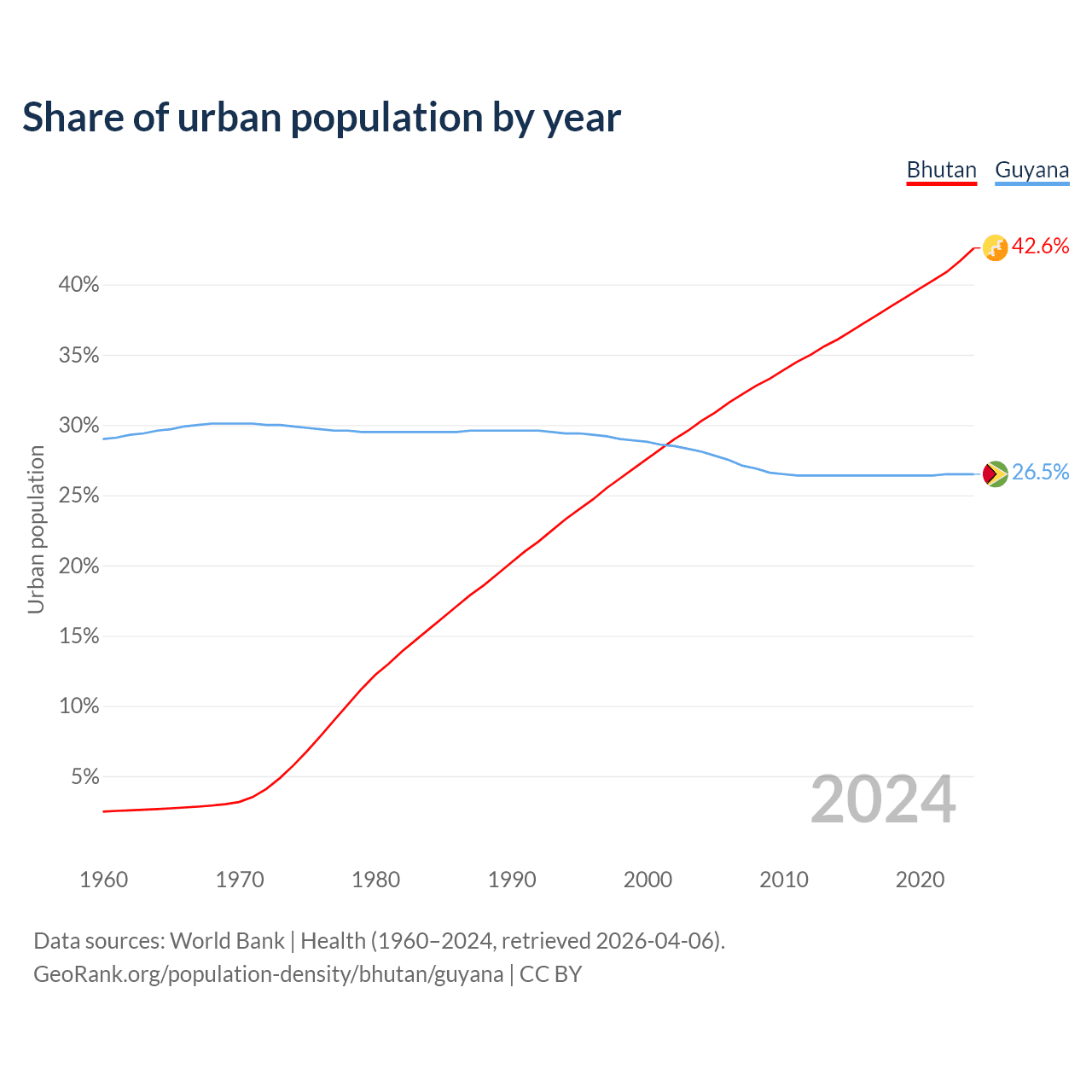From 2006 to 2026, population density in Bhutan increased by 19.5%, compared to a 3.3% growth in Guyana.