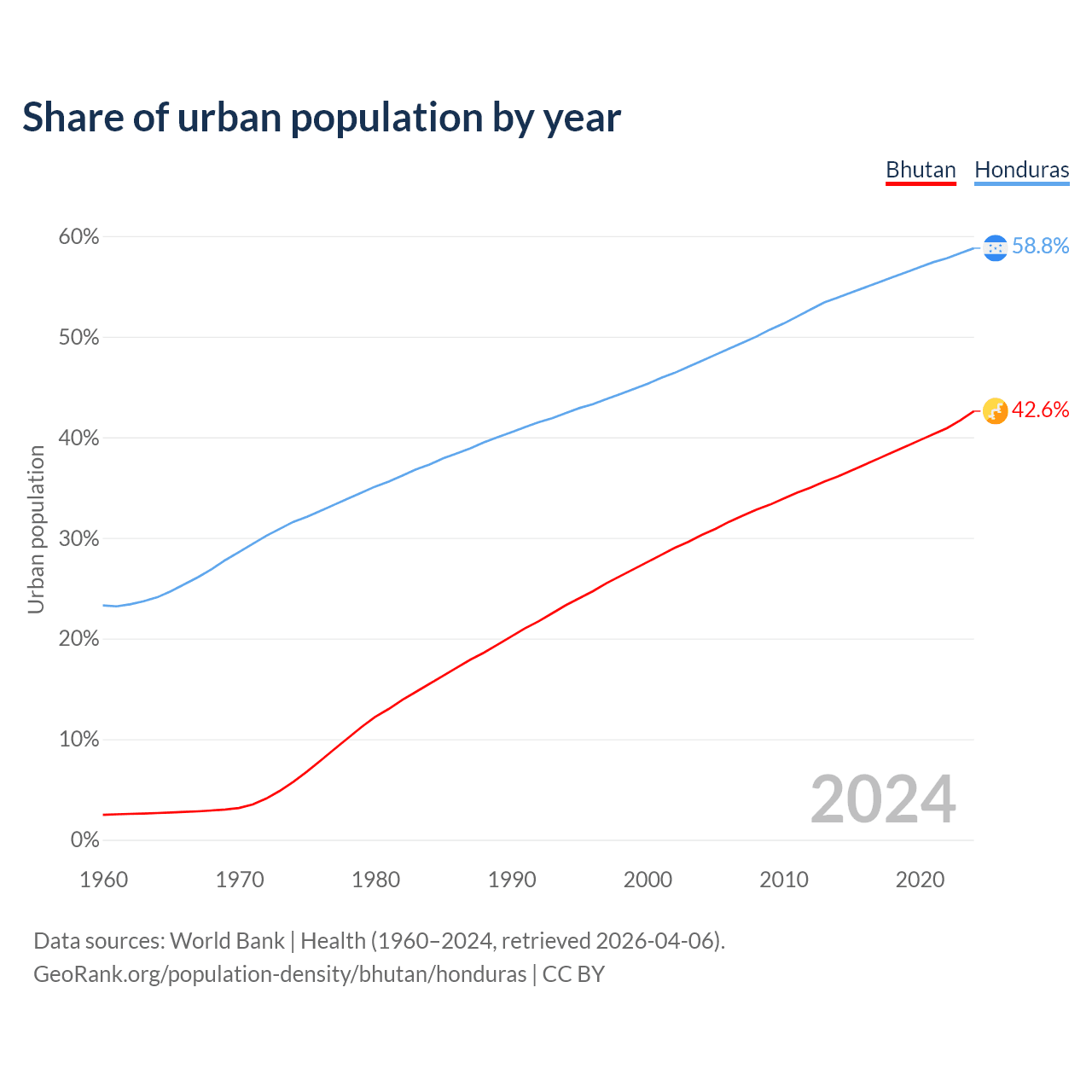 From 2004 to 2024, the share of urban population changed from 30.3% to 42.6% in Bhutan and from 47.6% to 58.8% in Honduras.