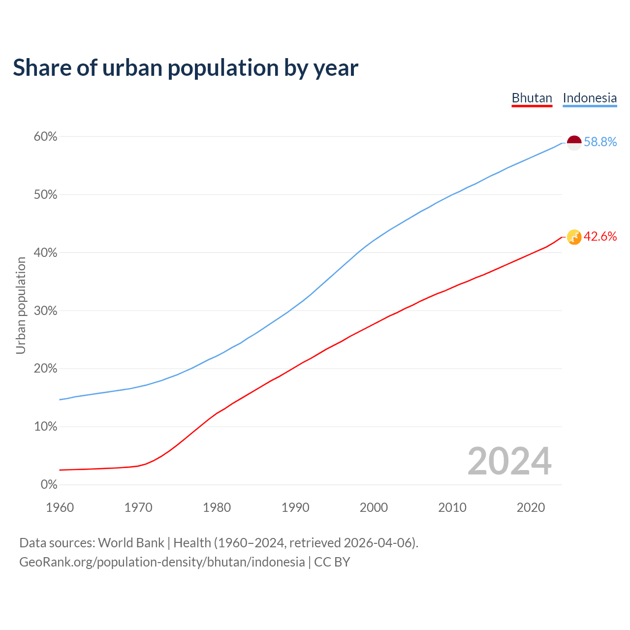 From 2004 to 2024, the share of urban population changed from 30.3% to 42.6% in Bhutan and from 45.4% to 58.8% in Indonesia.