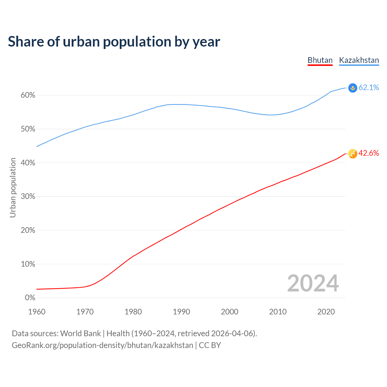 From 2004 to 2024, the share of urban population changed from 30.3% to 42.6% in Bhutan and from 54.9% to 62.1% in Kazakhstan.