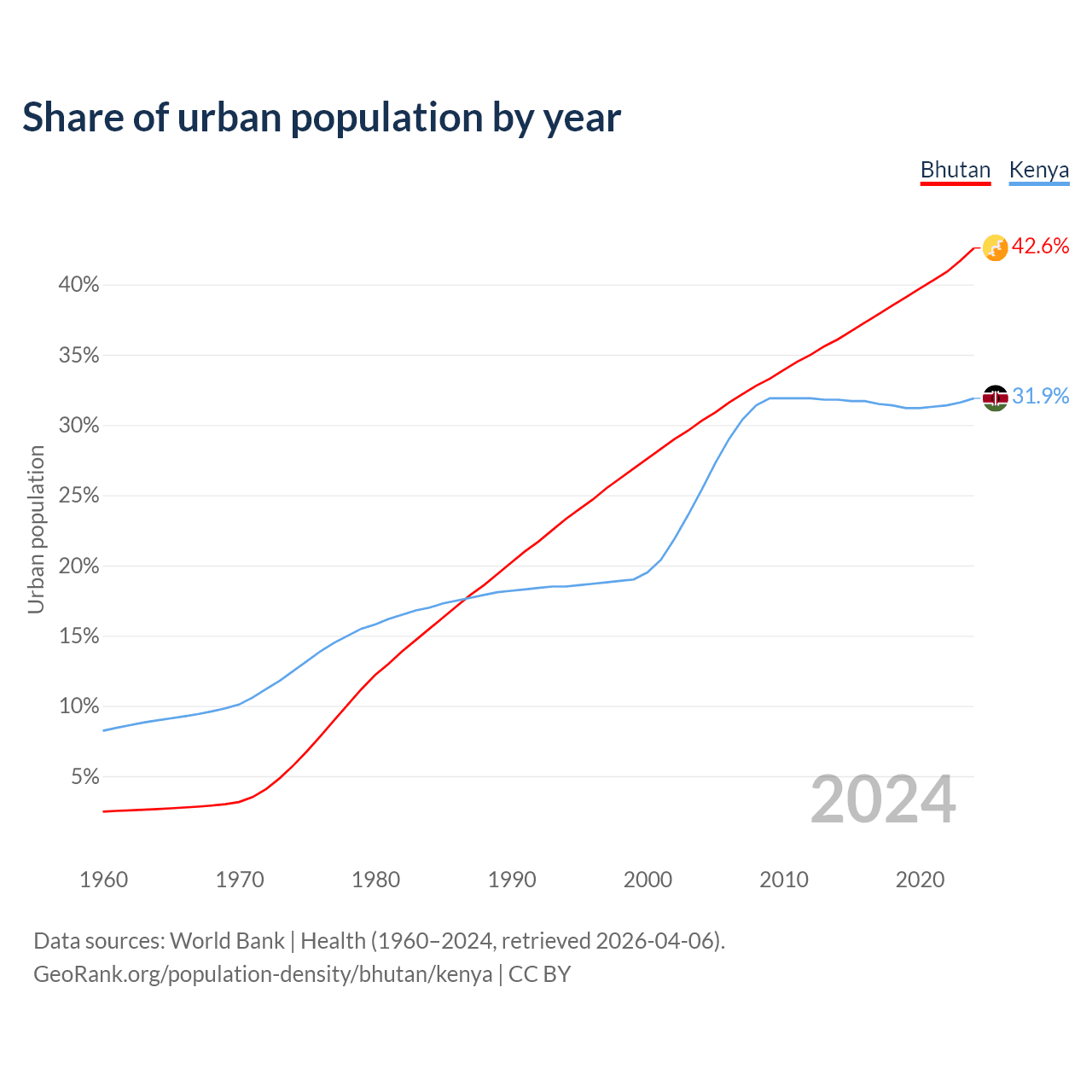 From 2006 to 2026, population density in Bhutan increased by 19.5%, compared to a 55.7% growth in Kenya.