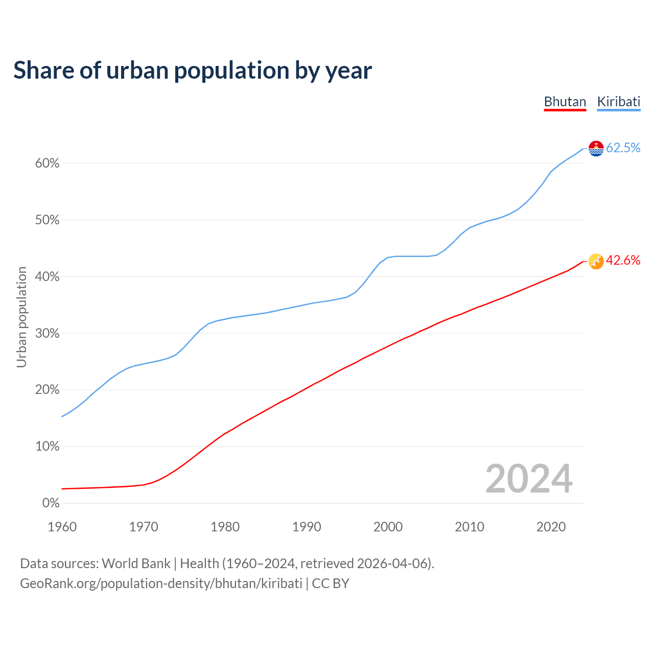 From 2004 to 2024, the share of urban population changed from 30.3% to 42.6% in Bhutan and from 43.5% to 62.5% in Kiribati.
