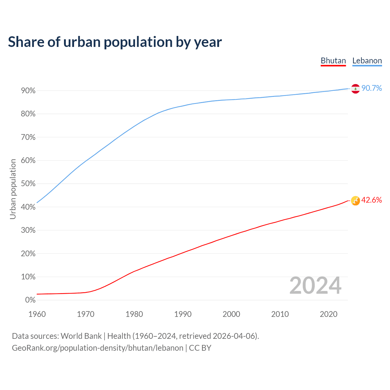 From 2006 to 2026, population density in Bhutan increased by 19.5%, compared to a 24% growth in Lebanon.