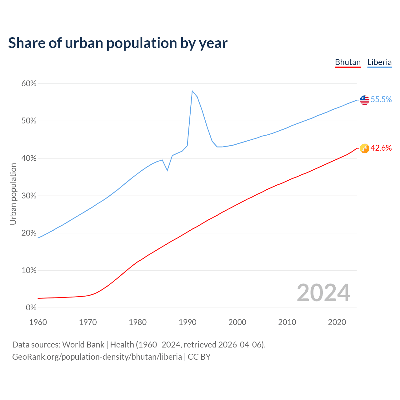 From 2004 to 2024, the share of urban population changed from 30.3% to 42.6% in Bhutan and from 45.4% to 55.5% in Liberia.