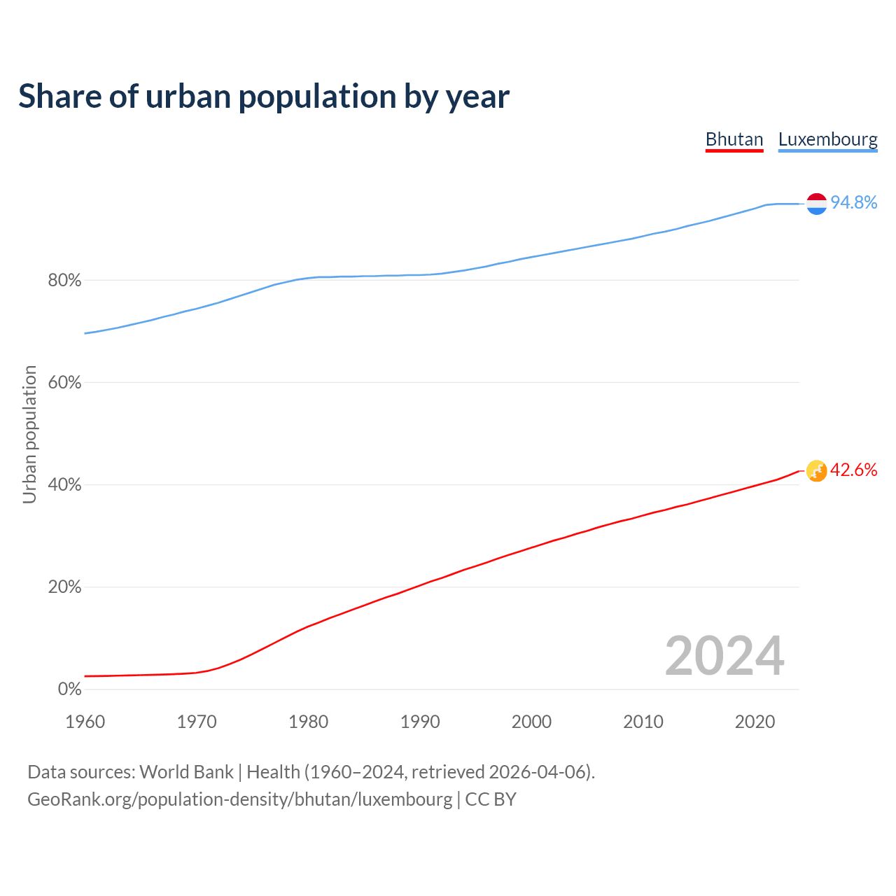 From 2004 to 2024, the share of urban population changed from 30.3% to 42.6% in Bhutan and from 86% to 94.8% in Luxembourg.