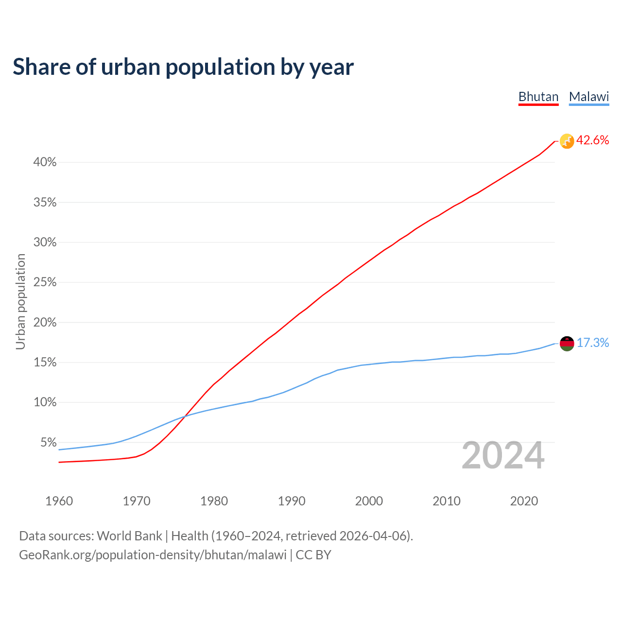 From 2004 to 2024, the share of urban population changed from 30.3% to 42.6% in Bhutan and from 15% to 17.3% in Malawi.