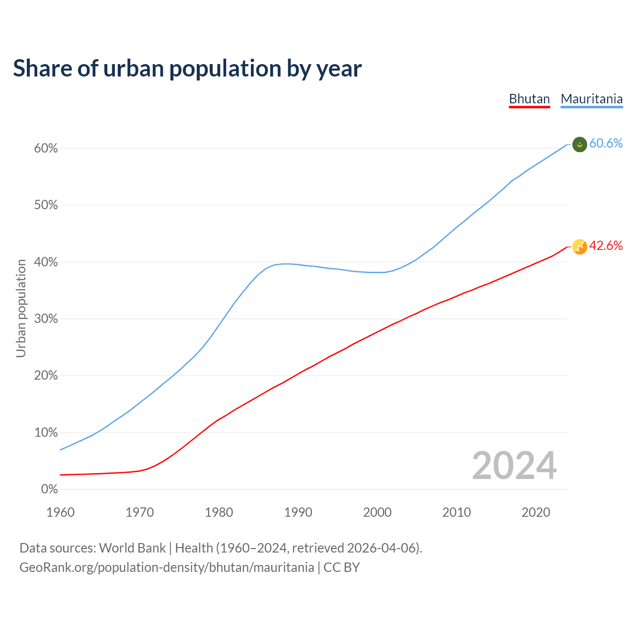 From 2004 to 2024, the share of urban population changed from 30.3% to 42.6% in Bhutan and from 39.6% to 60.6% in Mauritania.