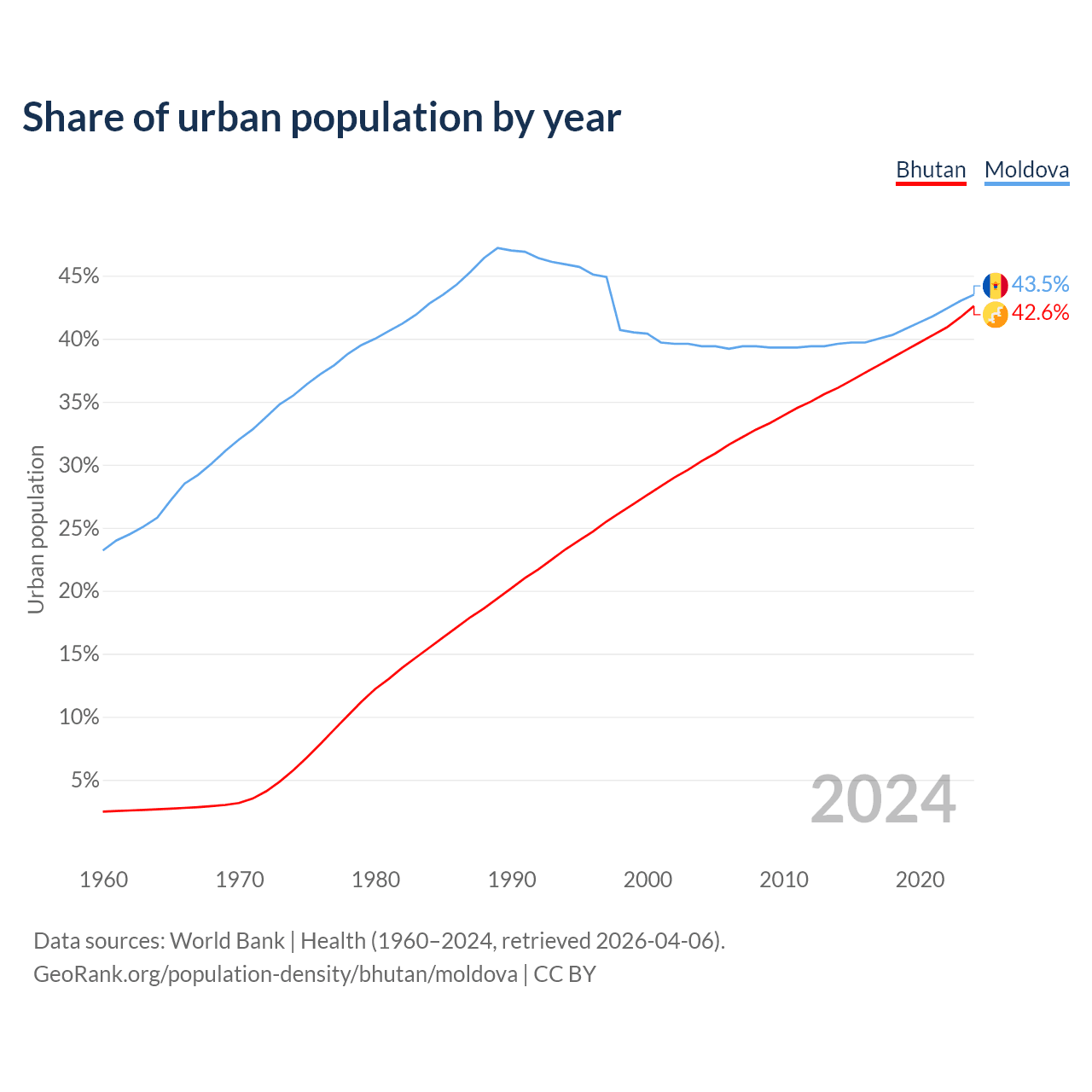 From 2004 to 2024, the share of urban population changed from 30.3% to 42.6% in Bhutan and from 39.4% to 43.5% in Moldova.