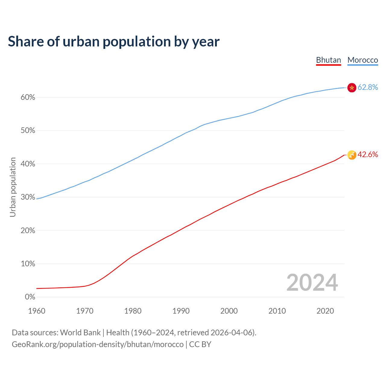 From 2004 to 2024, the share of urban population changed from 30.3% to 42.6% in Bhutan and from 55% to 62.8% in Morocco.