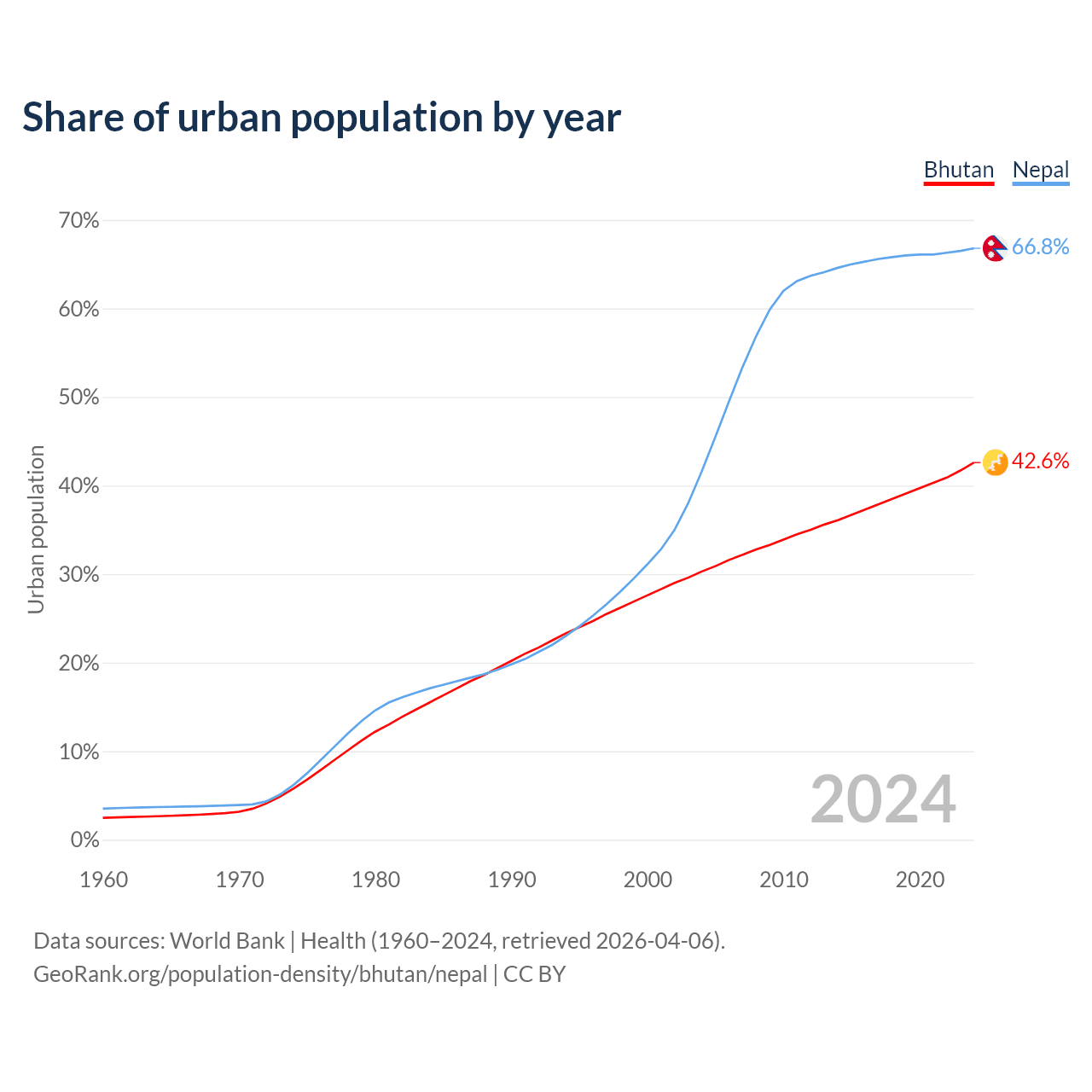 From 2004 to 2024, the share of urban population changed from 30.3% to 42.6% in Bhutan and from 41.6% to 66.8% in Nepal.