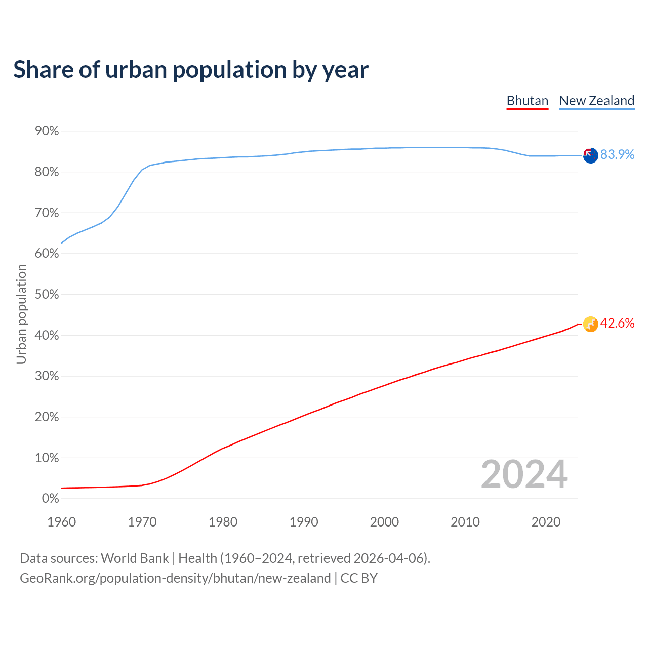 From 2006 to 2026, population density in Bhutan increased by 19.5%, compared to a 28.2% growth in New Zealand.