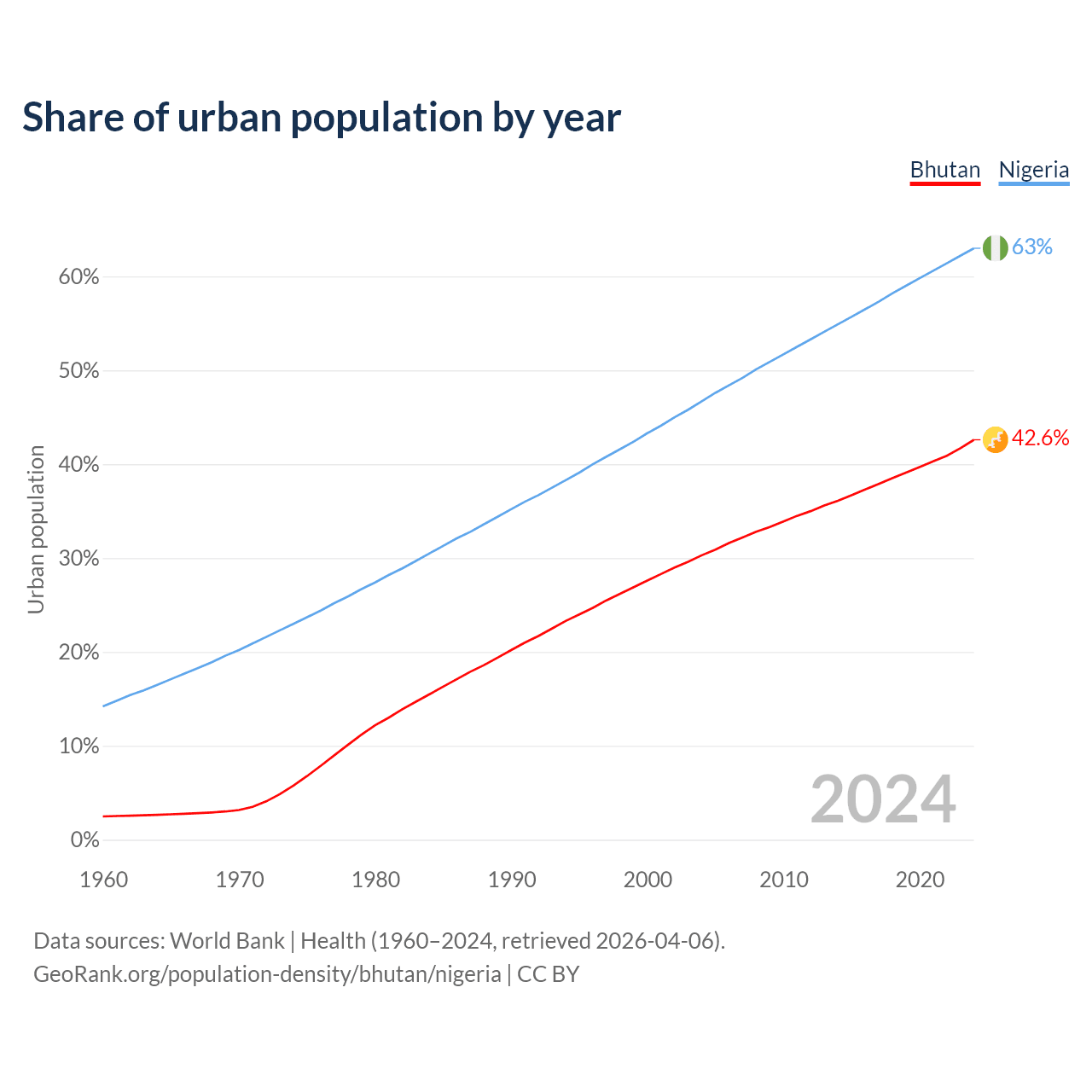 From 2004 to 2024, the share of urban population changed from 30.3% to 42.6% in Bhutan and from 46.7% to 63% in Nigeria.
