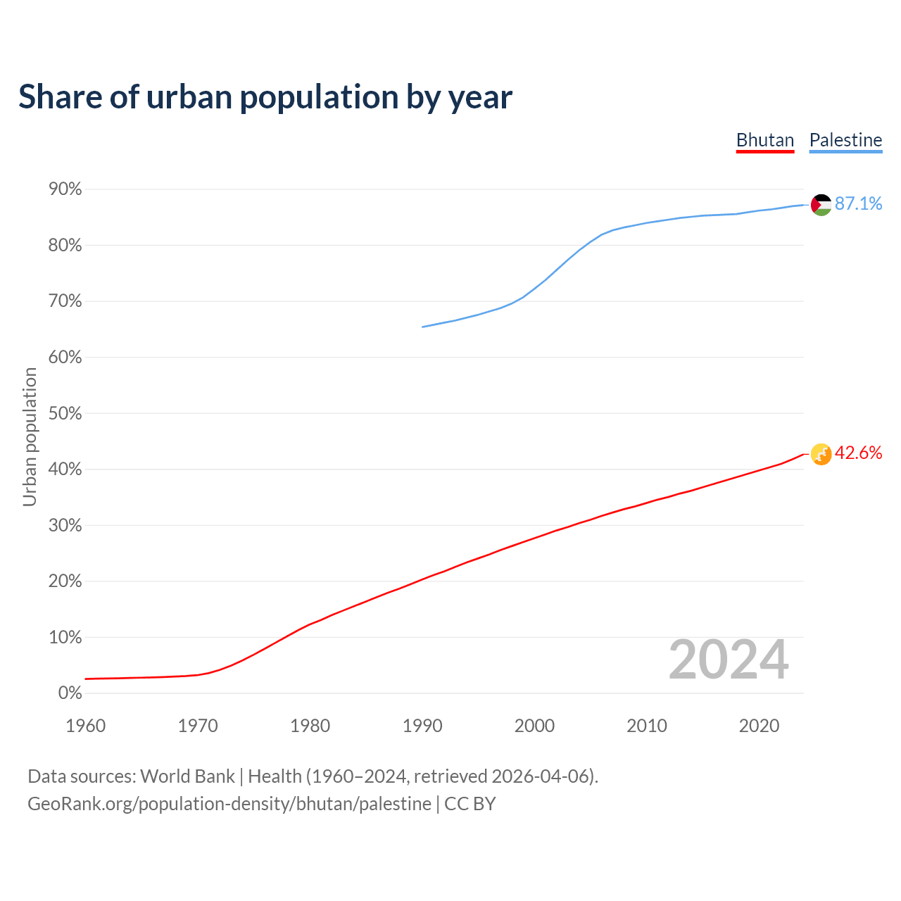 From 2004 to 2024, the share of urban population changed from 30.3% to 42.6% in Bhutan and from 79% to 87.1% in Palestine.