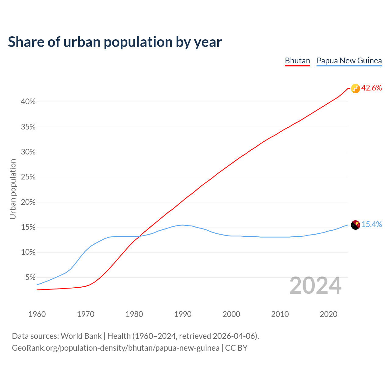 From 2004 to 2024, the share of urban population changed from 30.3% to 42.6% in Bhutan and from 13.1% to 15.4% in Papua New Guinea.