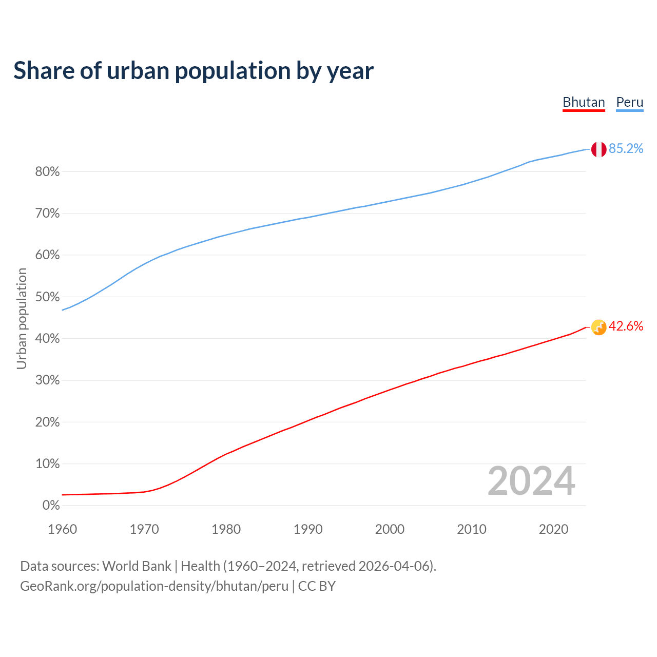 From 2004 to 2024, the share of urban population changed from 30.3% to 42.6% in Bhutan and from 74.4% to 85.2% in Peru.