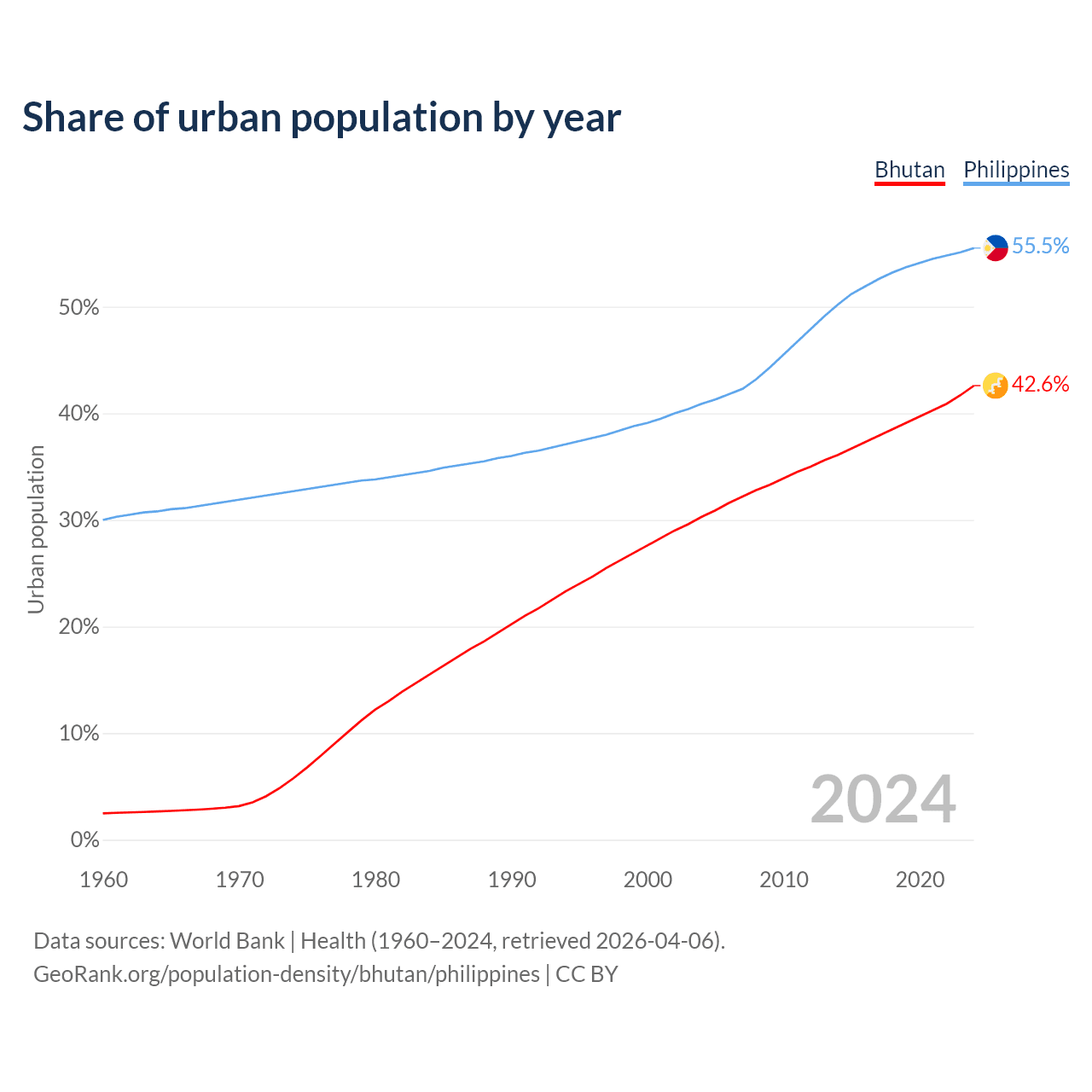 From 2004 to 2024, the share of urban population changed from 30.3% to 42.6% in Bhutan and from 40.9% to 55.5% in the Philippines.