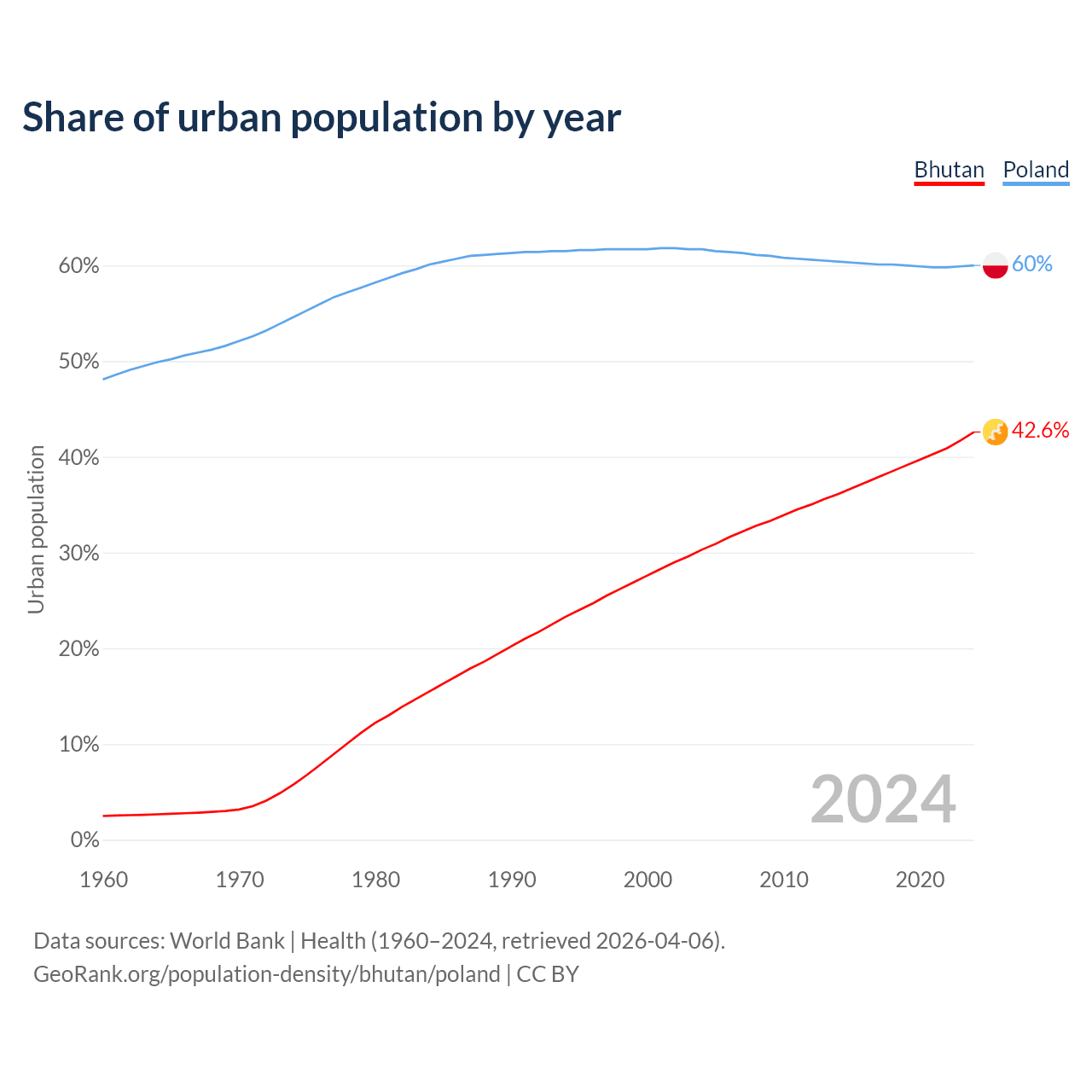 From 2006 to 2026, population density in Bhutan increased by 19.5%, compared to a 6.1% decline in Poland.