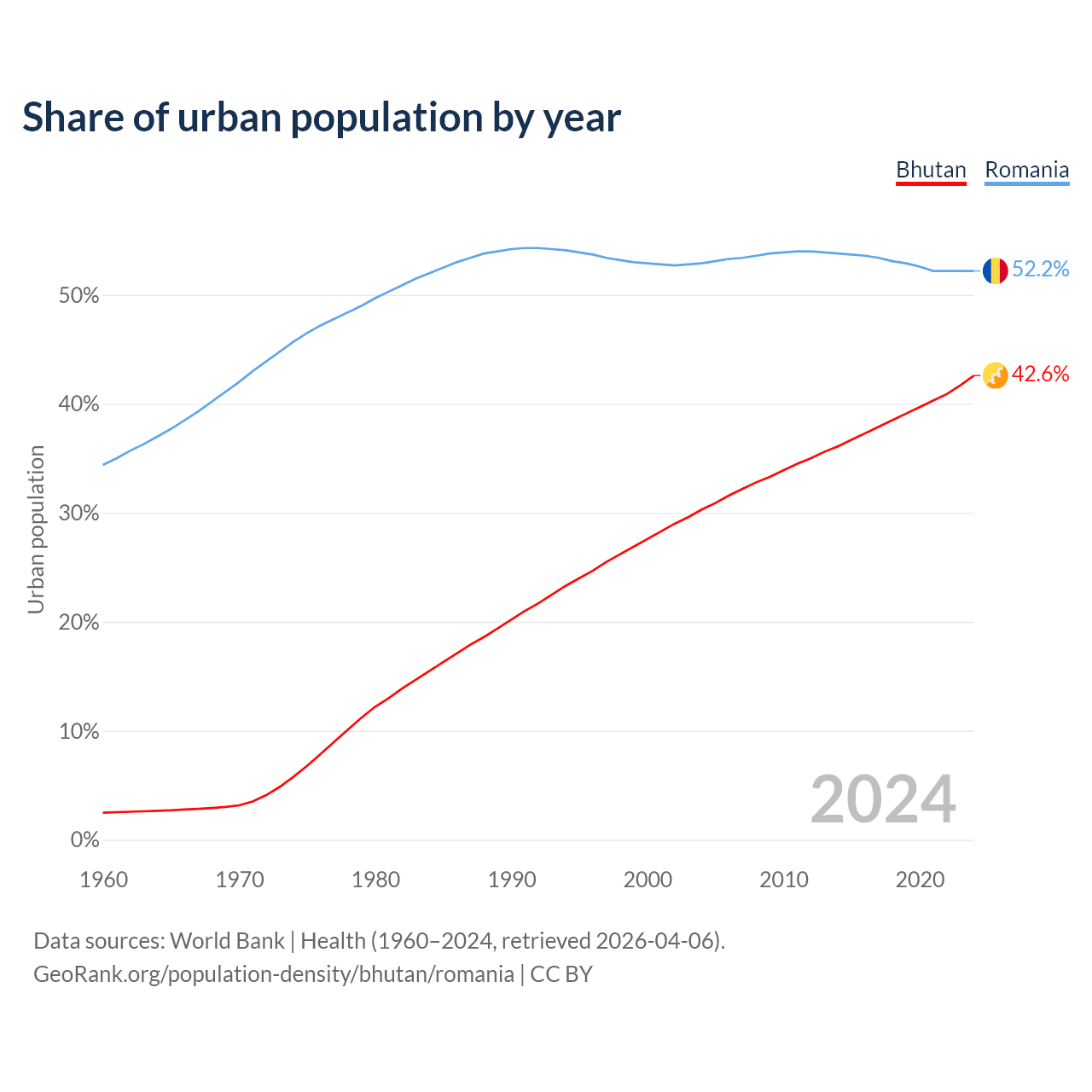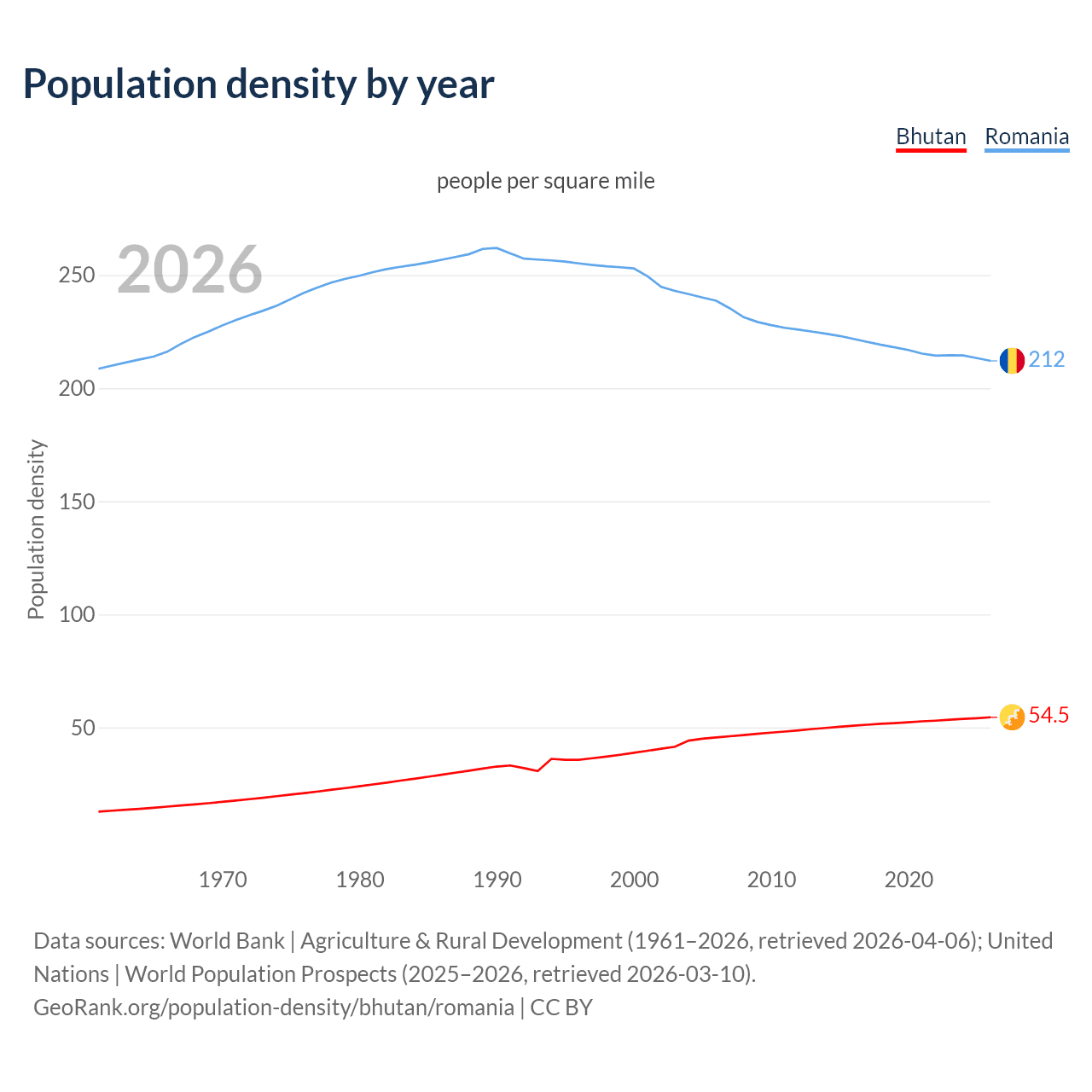 From 2006 to 2026, population density in Bhutan increased by 19.5%, compared to a 11.1% decline in Romania.