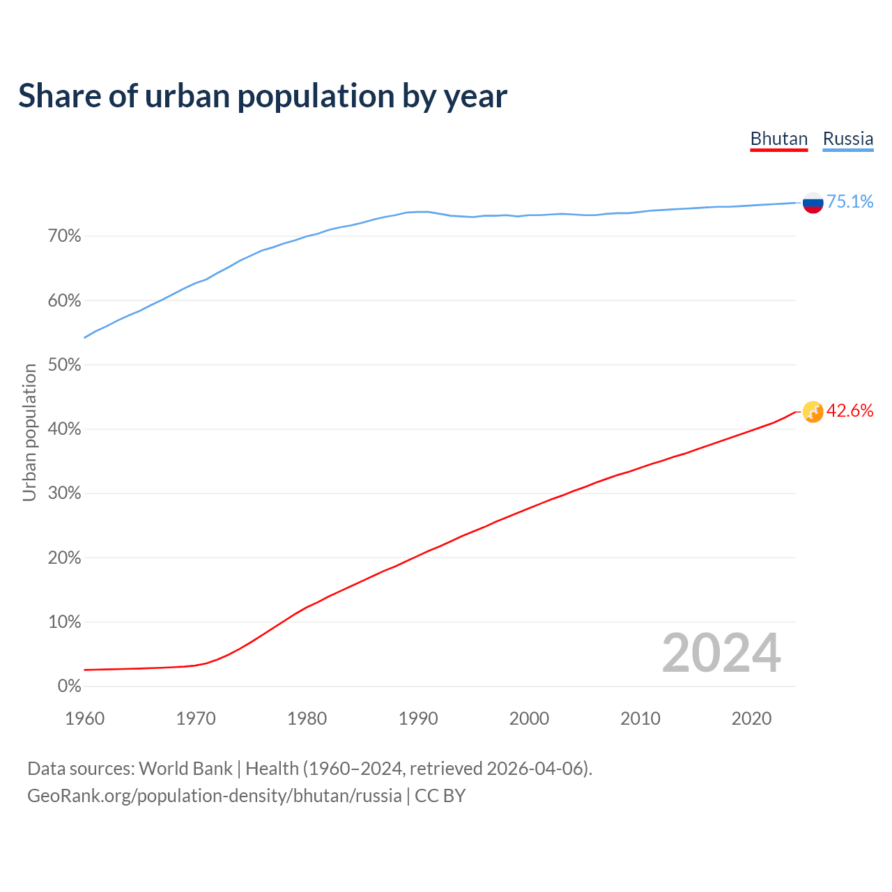 From 2004 to 2024, the share of urban population changed from 30.3% to 42.6% in Bhutan and from 73.3% to 75.1% in Russia.