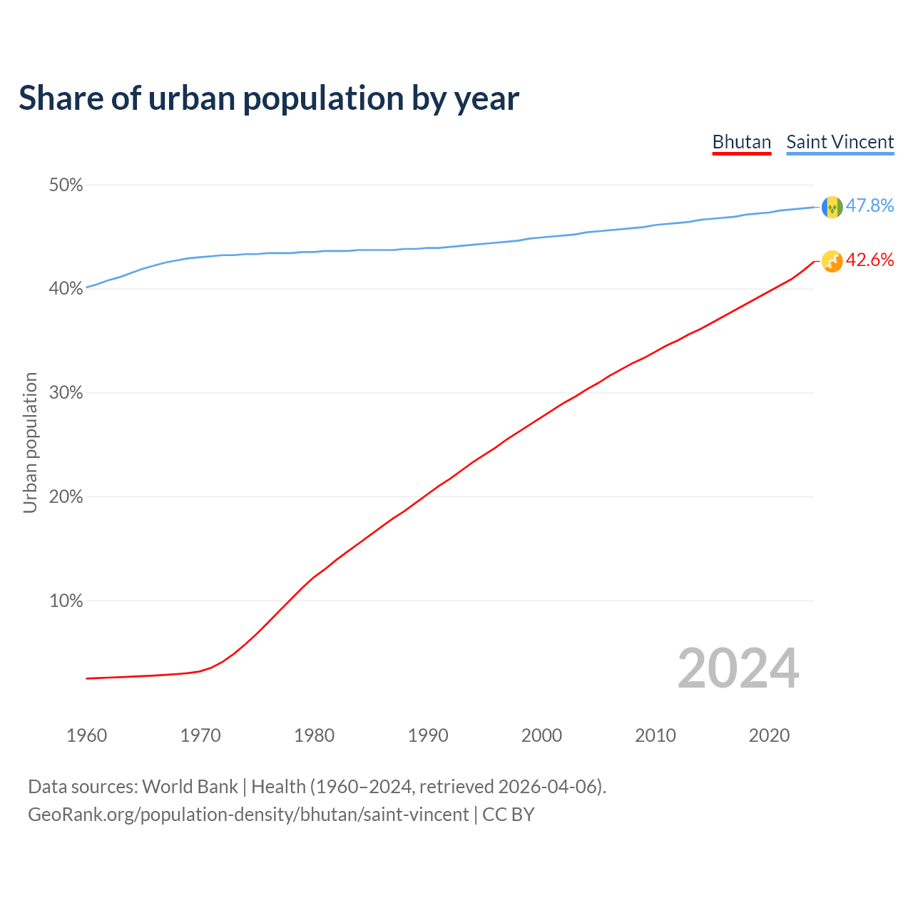 From 2004 to 2024, the share of urban population changed from 30.3% to 42.6% in Bhutan and from 45.4% to 47.8% in Saint Vincent.