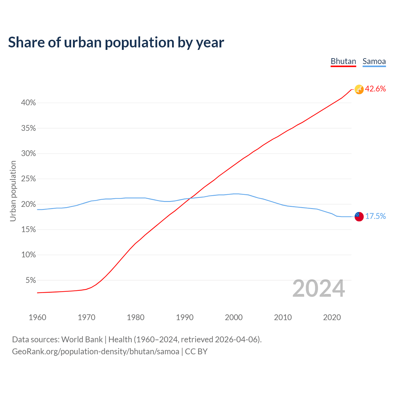 From 2006 to 2026, population density in Bhutan increased by 19.5%, compared to a 19.6% growth in Samoa.