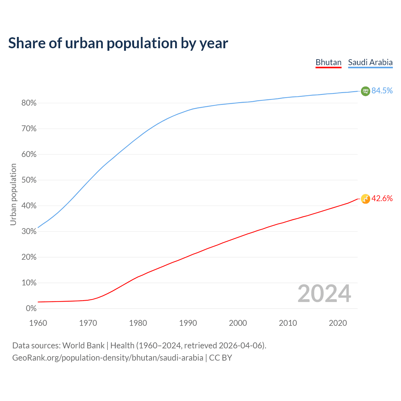 From 2006 to 2026, population density in Bhutan increased by 19.5%, compared to a 70.4% growth in Saudi Arabia.