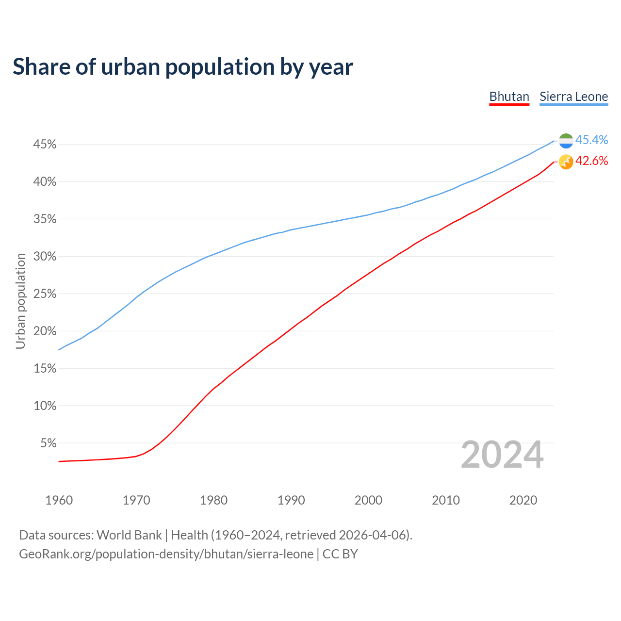 From 2004 to 2024, the share of urban population changed from 30.3% to 42.6% in Bhutan and from 36.5% to 45.4% in Sierra Leone.