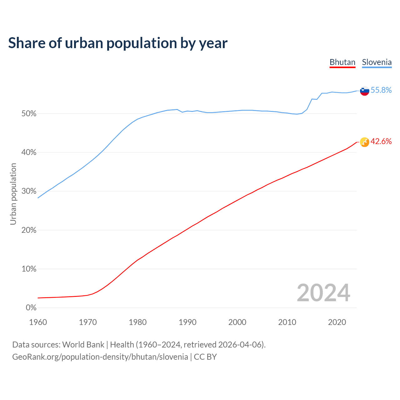 From 2004 to 2024, the share of urban population changed from 30.3% to 42.6% in Bhutan and from 50.7% to 55.8% in Slovenia.