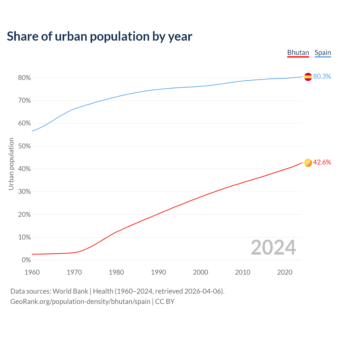 From 2004 to 2024, the share of urban population changed from 30.3% to 42.6% in Bhutan and from 77% to 80.3% in Spain.