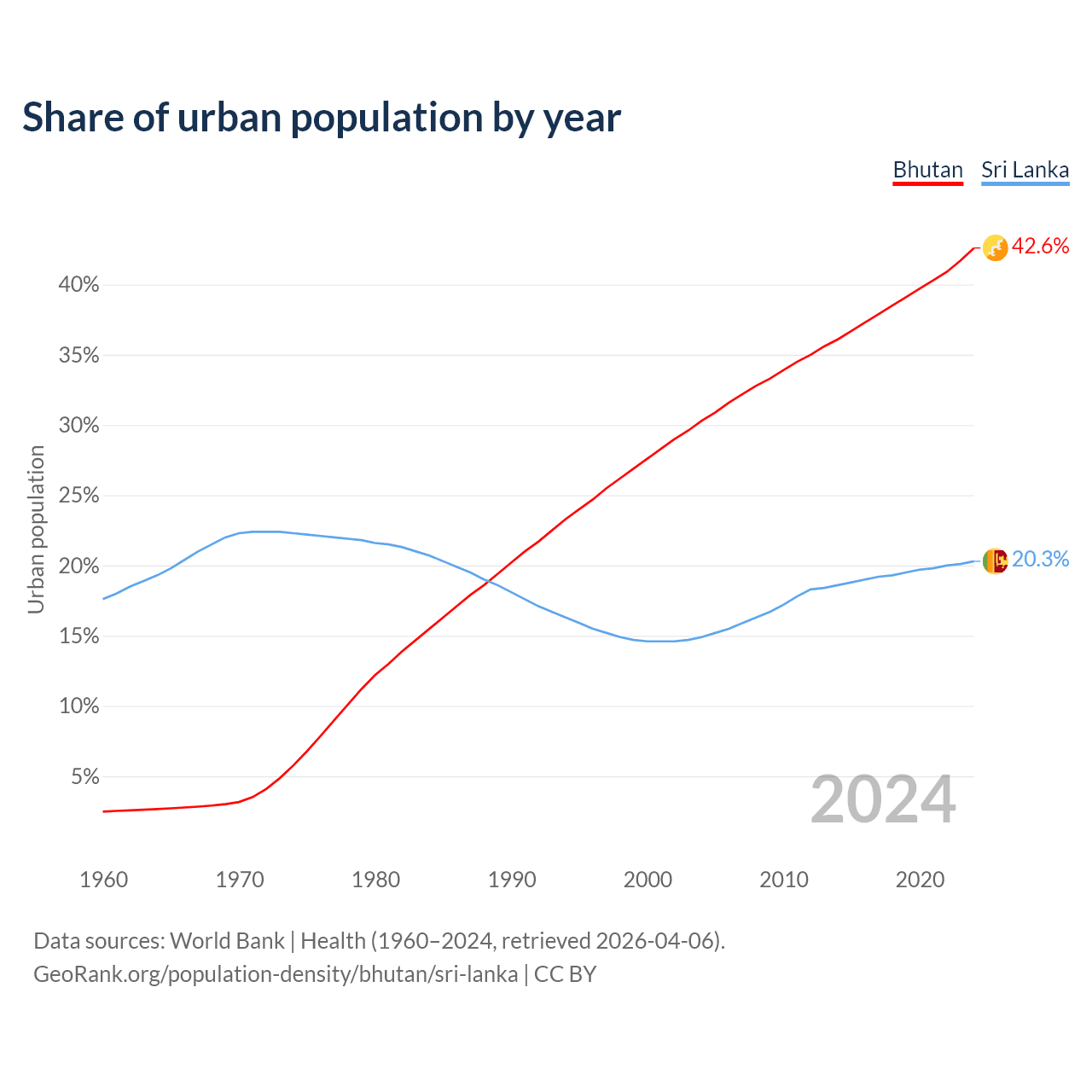 From 2006 to 2026, population density in Bhutan increased by 19.5%, compared to a 10.4% growth in Sri Lanka.