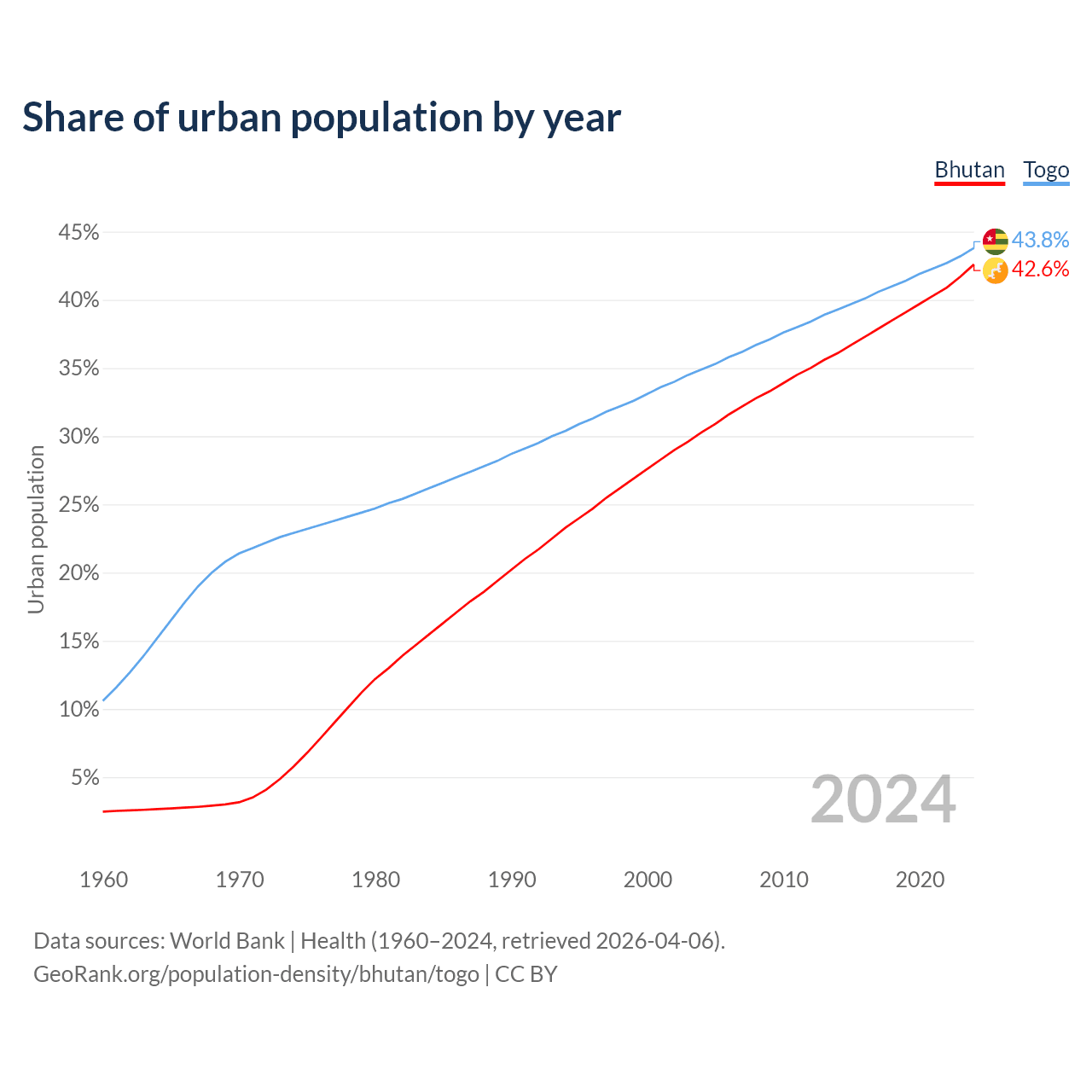 From 2004 to 2024, the share of urban population changed from 30.3% to 42.6% in Bhutan and from 34.9% to 43.8% in Togo.