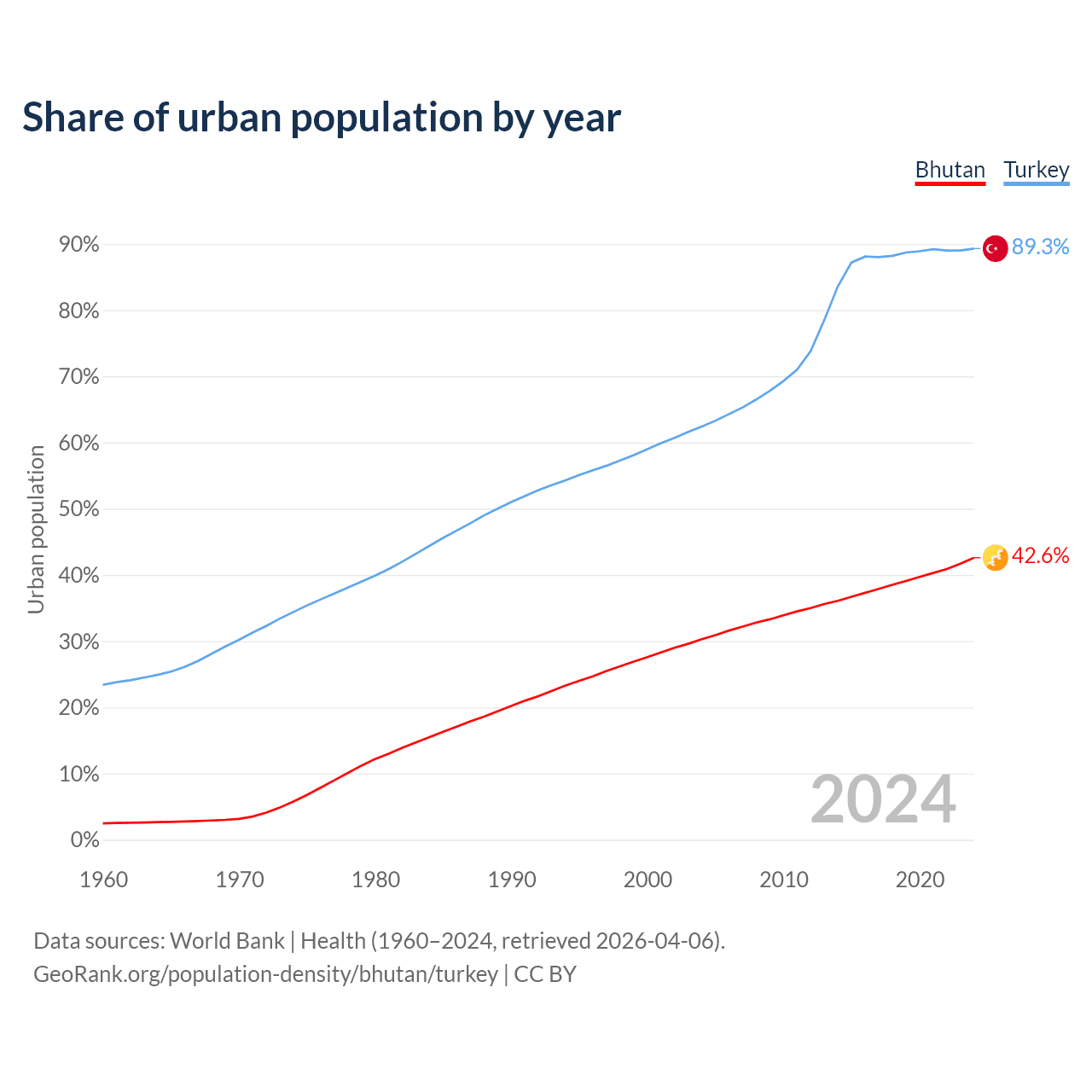 From 2004 to 2024, the share of urban population changed from 30.3% to 42.6% in Bhutan and from 62.4% to 89.3% in Turkey.