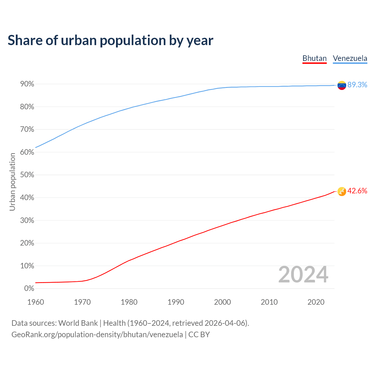 From 2004 to 2024, the share of urban population changed from 30.3% to 42.6% in Bhutan and from 88.6% to 89.3% in Venezuela.