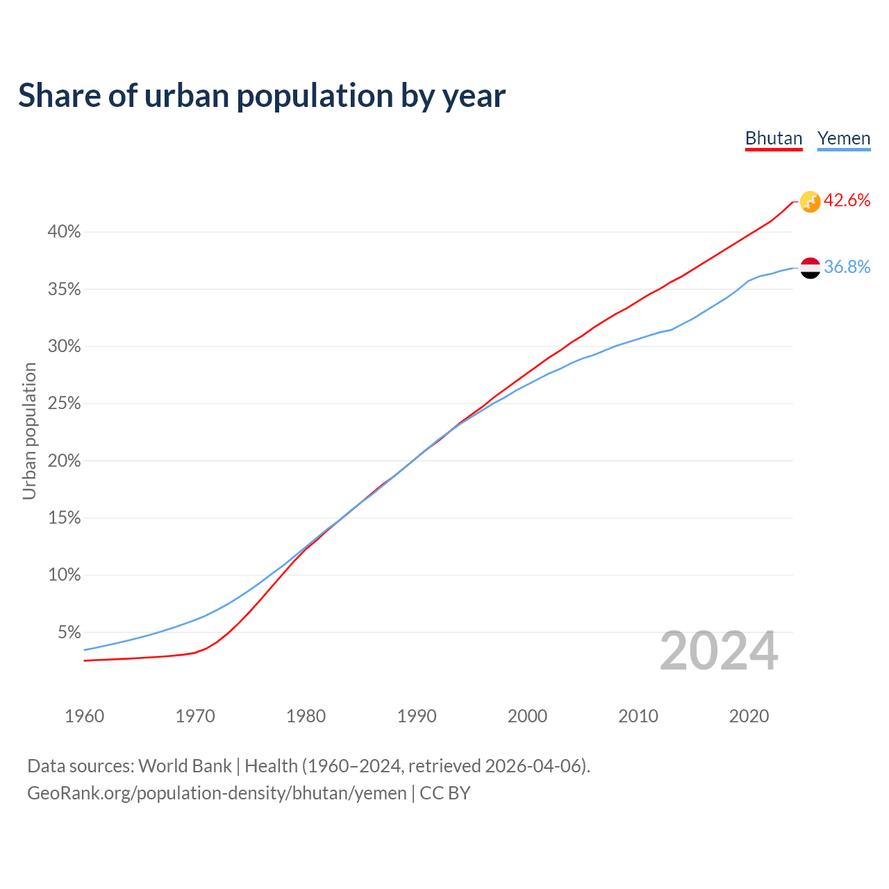 From 2006 to 2026, population density in Bhutan increased by 19.5%, compared to a 82.6% growth in Yemen.