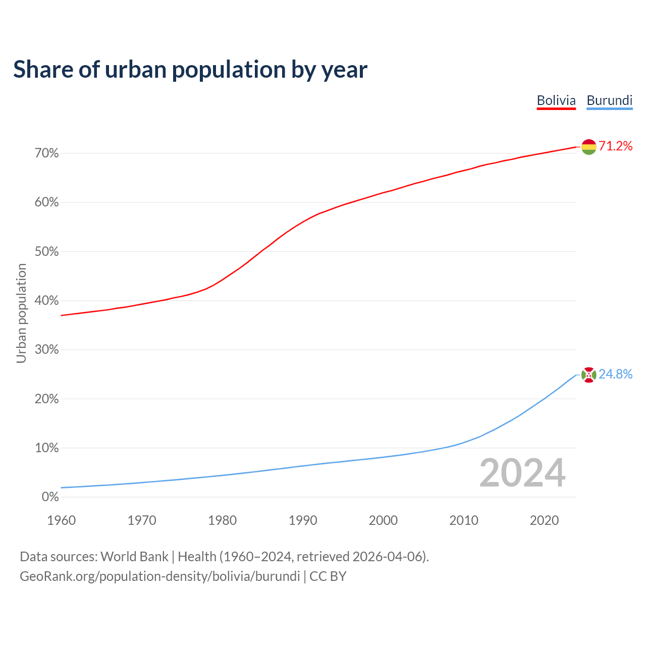 From 2004 to 2024, the share of urban population changed from 63.8% to 71.2% in Bolivia and from 8.92% to 24.8% in Burundi.