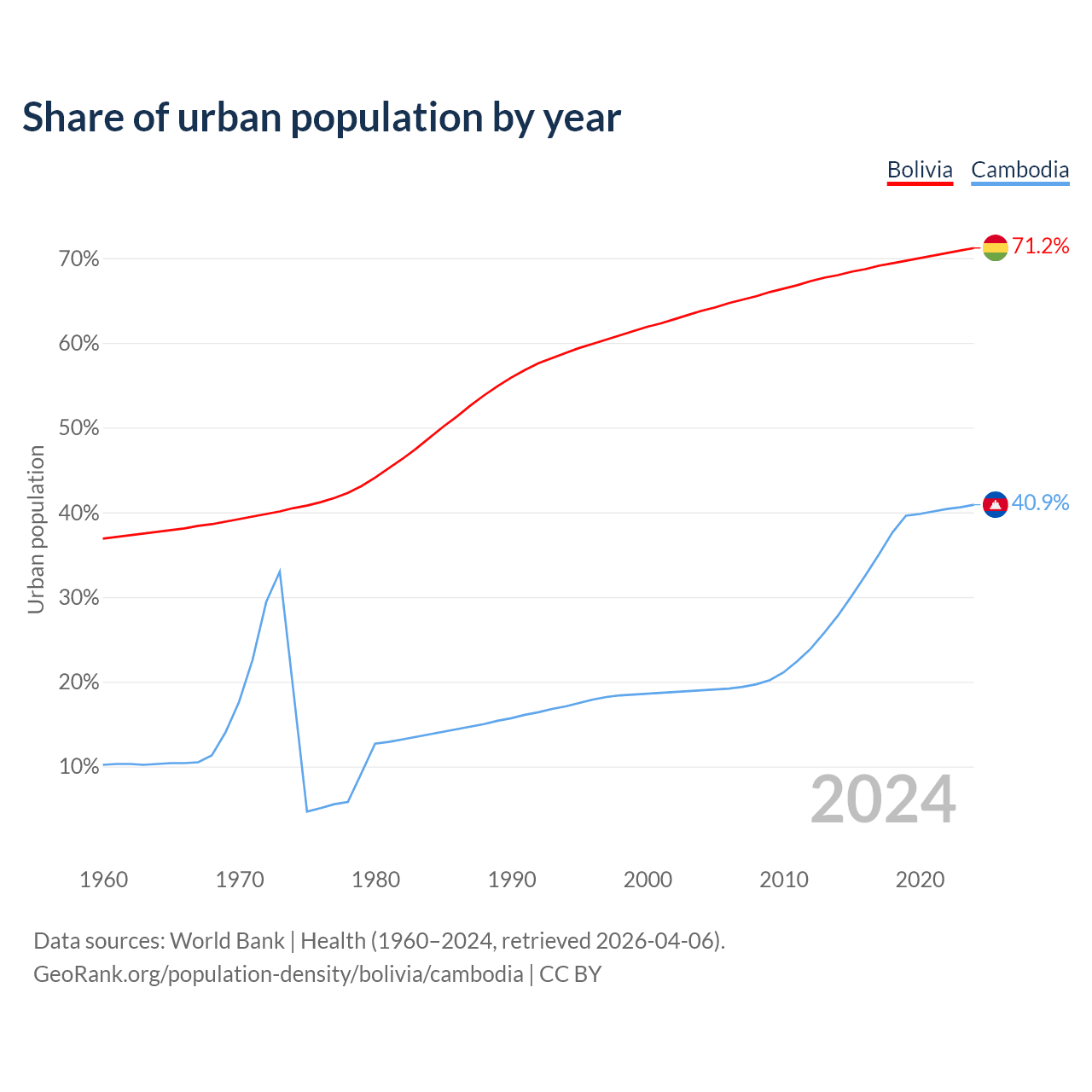 From 2004 to 2024, the share of urban population changed from 63.8% to 71.2% in Bolivia and from 19% to 40.9% in Cambodia.