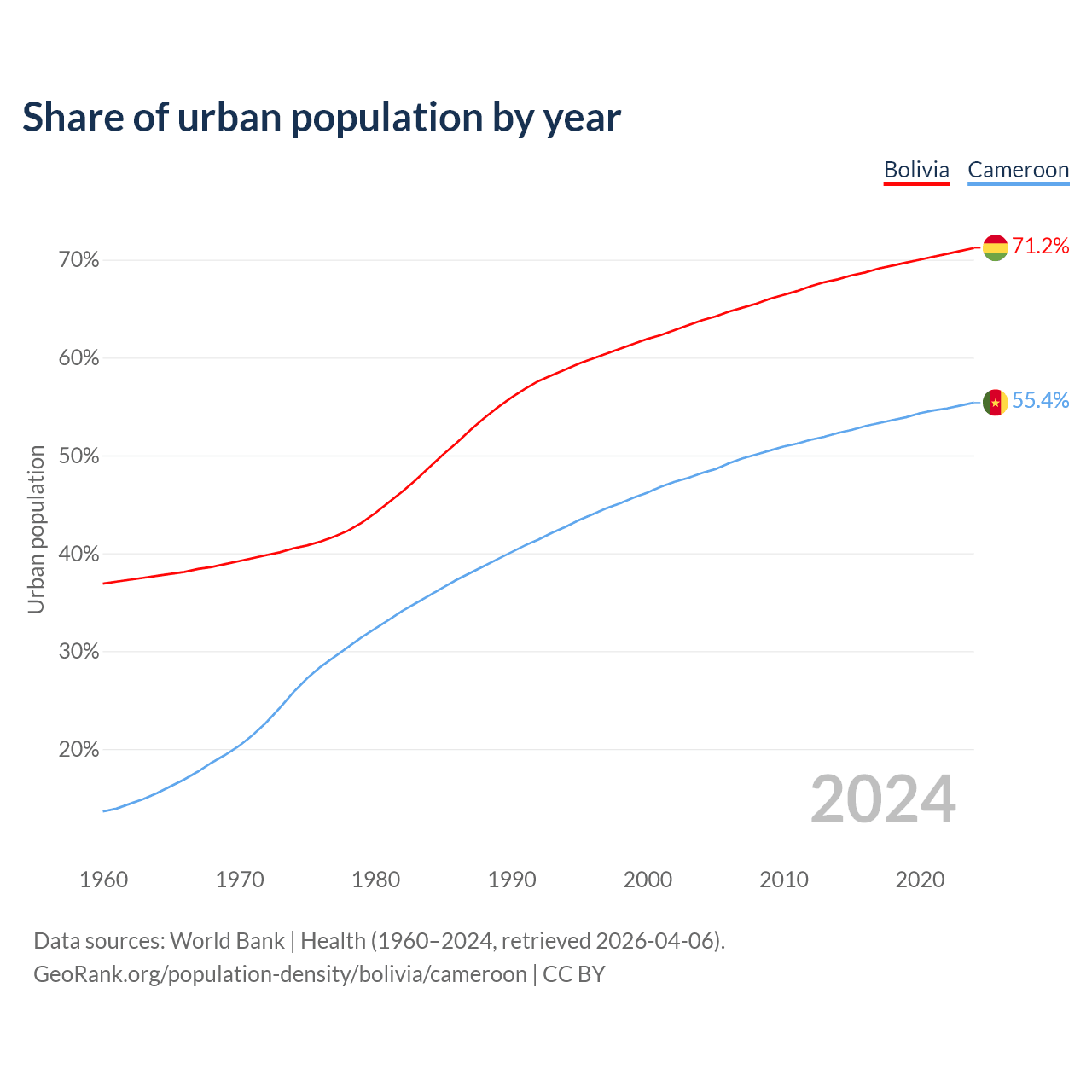 From 2004 to 2024, the share of urban population changed from 63.8% to 71.2% in Bolivia and from 48.2% to 55.4% in Cameroon.