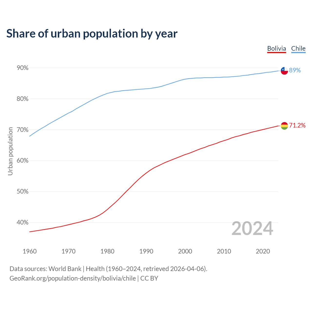 From 2004 to 2024, the share of urban population changed from 63.8% to 71.2% in Bolivia and from 86.7% to 89% in Chile.