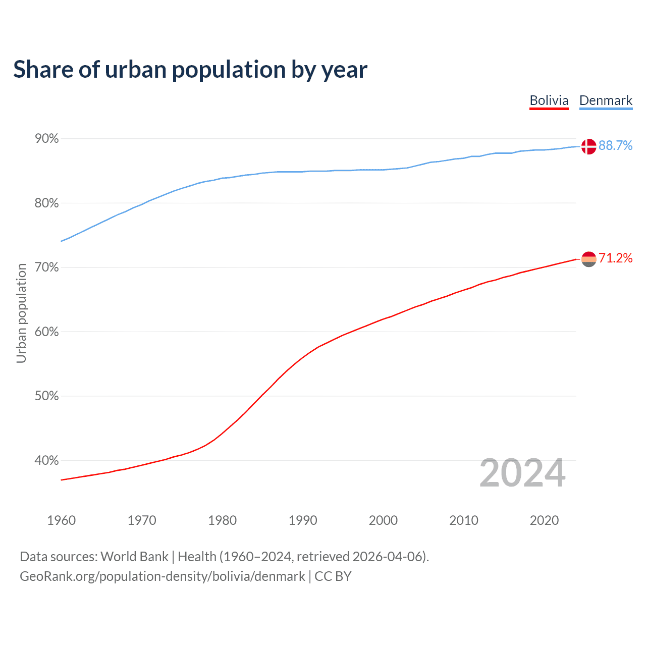 From 2004 to 2024, the share of urban population changed from 63.8% to 71.2% in Bolivia and from 85.7% to 88.7% in Denmark.