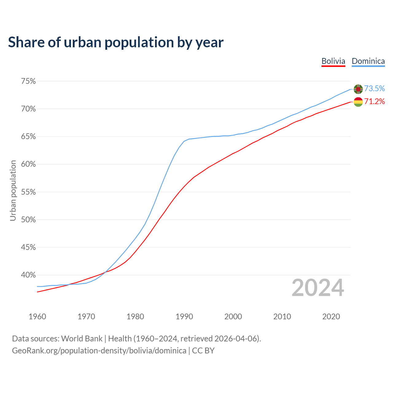 From 2004 to 2024, the share of urban population changed from 63.8% to 71.2% in Bolivia and from 66% to 73.5% in Dominica.